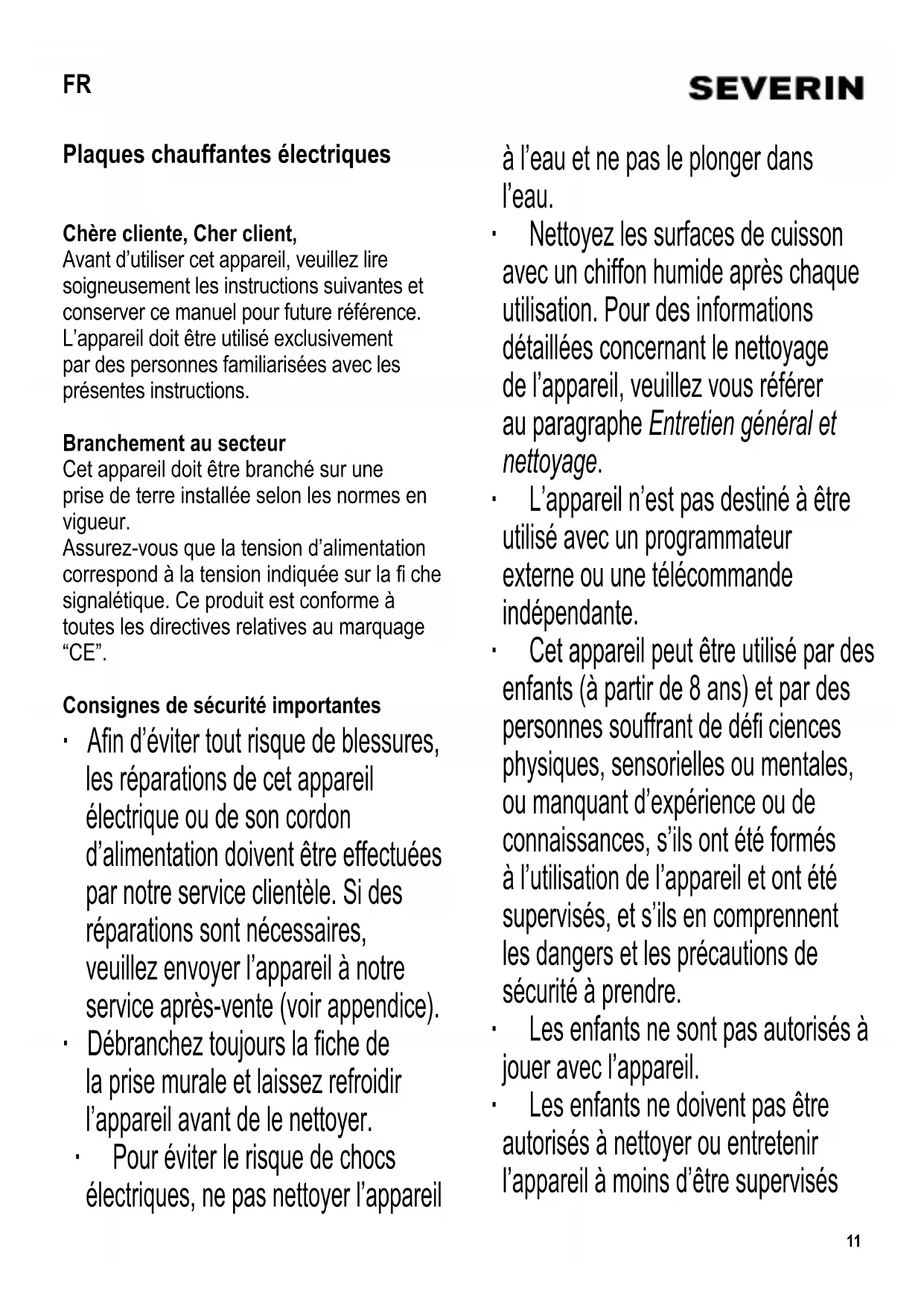 Caution - hot surfaces: This symbol draws attention to the fact that the accessible housing surfaces – especially on and around the hot-plate - may become very hot during operation. Do not remove the warning sticker with this symbol. ∙ Do not leave the appliance unattended while in use. ∙ Caution: When overheated, food may tend to ignite. However, the likelihood of this occurring is increased where food with a high fat or oil content is concerned. ∙ Do not position or operate the appliance close to or underneath any wall- cupboards or hanging objects such as curtains or any other infl ammable materials. ∙ During operation, the appliance must be placed on a heat-resistant surface, impervious to splashes, stains or hot steam. ∙ Always ensure that air is able to circulate freely underneath the unit. A minimum distance of 10 cm to any wall must also be observed ∙ The ventilation slots underneath the unit must not be covered during use. ∙ Always remove the plug from the wall socket - in case of any malfunction, - after use, and also - before cleaning the appliance. ∙ When removing the plug from the wall socket, never pull on the power cord; always grip the plug itself. ∙ Do not let the power cord hang free. ∙ Do not allow the power cord to touch any hot parts of the appliance. ∙ No responsibility will be accepted if damage results from improper use, or if these instructions are not complied with. ∙ This appliance is intended for domestic or similar applications, such as - in shops, offi ces and other similar working environments, - in agricultural areas, - by customers in hotels, motels etc. and similar establishments, - in bed-and breakfast type environments. Start up Before using the appliance for the fi rst time, let it heat up for approximately 3 minutes at maximum power (but without using a pot or saucepan), while ensuring suffi cient ventilation. During this process, a slight smell and a little smoke may be emitted. This is normal and will only last for a very short time. Ensure adequate ventilation by opening windows or balcony doors. Clean the appliance afterwards as described in section General care and cleaning) below. Operation ∙ Always place a pot / saucepan on the hot-plate before the appliance is switched10 on. ∙ Ensure that the pot is clean and dry on the outside. Do not use stain covered pots / saucepans. ∙ To prevent damage to the hot-plate, only use pots / saucepans with fl at bottoms. Most suitable are pots specifi cally designed for use on electric plates (see picture I). ∙ Always make sure that the pot / saucepan used is of at least the same diameter as the plate; this minimises the loss of heat and prevents the plate from being damaged as a result of uneven heat distribution. Thermostat setting MAX : Pre-cooking and quick frying 4-5 : Regular cooking, frying 3-4 : Simmering 1-2 : Keeping warm Set the thermostat knob to the ‘MIN’ position after use. Remove the plug from the wall socket afterwards to ensure that the appliance is completely disconnected from the mains. Indicator light The indicator light stays on while the hot- plate is heating up. It goes out once the pre-set temperature has been reached. General care and cleaning ∙ Before cleaning the appliance, ensure it is disconnected from the power supply and has cooled down completely. ∙ To avoid the risk of electric shock, do not clean the appliance with water and do not immerse it in water. ∙ Do not use abrasives or harsh cleaning solutions. ∙ After use, a wet cloth may be used to remove any spills from the plates. ∙ A special cleaning agent should be used to treat the plate from time to time. Disposal Devices marked with this symbol must be disposed of separately from your household waste, as they contain valuable materials which can be recycled. Proper disposal protects the environment and human health. Your local authority or retailer can provide information on the matter. Guarantee This product is guaranteed against defects in materials and workmanship for a period of two years from the date of purchase. Under this guarantee the manufacturer undertakes to repair or replace any parts found to be defective, providing the product is returned to one of our authorised service centres. This guarantee is only valid if the appliance has been used in accordance with the instructions, and provided that it has not been modifi ed, repaired or interfered with by any unauthorised person, or damaged through misuse. This guarantee naturally does not cover wear and tear, nor breakables such as glass and ceramic items, bulbs etc. This guarantee does not affect your statutory rights, nor any legal rights you may have as a consumer under applicable national legislation governing the purchase of goods. If the product fails to operate and needs to be returned, pack it carefully, enclosing your name and address and the reason for return. If within the guarantee period, please also provide the guarantee card and proof of purchase.11 Plaques chauffantes électriques Chère cliente, Cher client, Avant d’utiliser cet appareil, veuillez lire soigneusement les instructions suivantes et conserver ce manuel pour future référence. L’appareil doit être utilisé exclusivement par des personnes familiarisées avec les présentes instructions. Branchement au secteur Cet appareil doit être branché sur une prise de terre installée selon les normes en vigueur. Assurez-vous que la tension d’alimentation correspond à la tension indiquée sur la fi che signalétique. Ce produit est conforme à toutes les directives relatives au marquage “CE”. Consignes de sécurité importantes ∙ A fi n d’éviter tout risque de blessures, les réparations de cet appareil électrique ou de son cordon d’alimentation doivent être effectuées par notre service clientèle. Si des réparations sont nécessaires, veuillez envoyer l’appareil à notre service après-vente (voir appendice). ∙ Débranchez