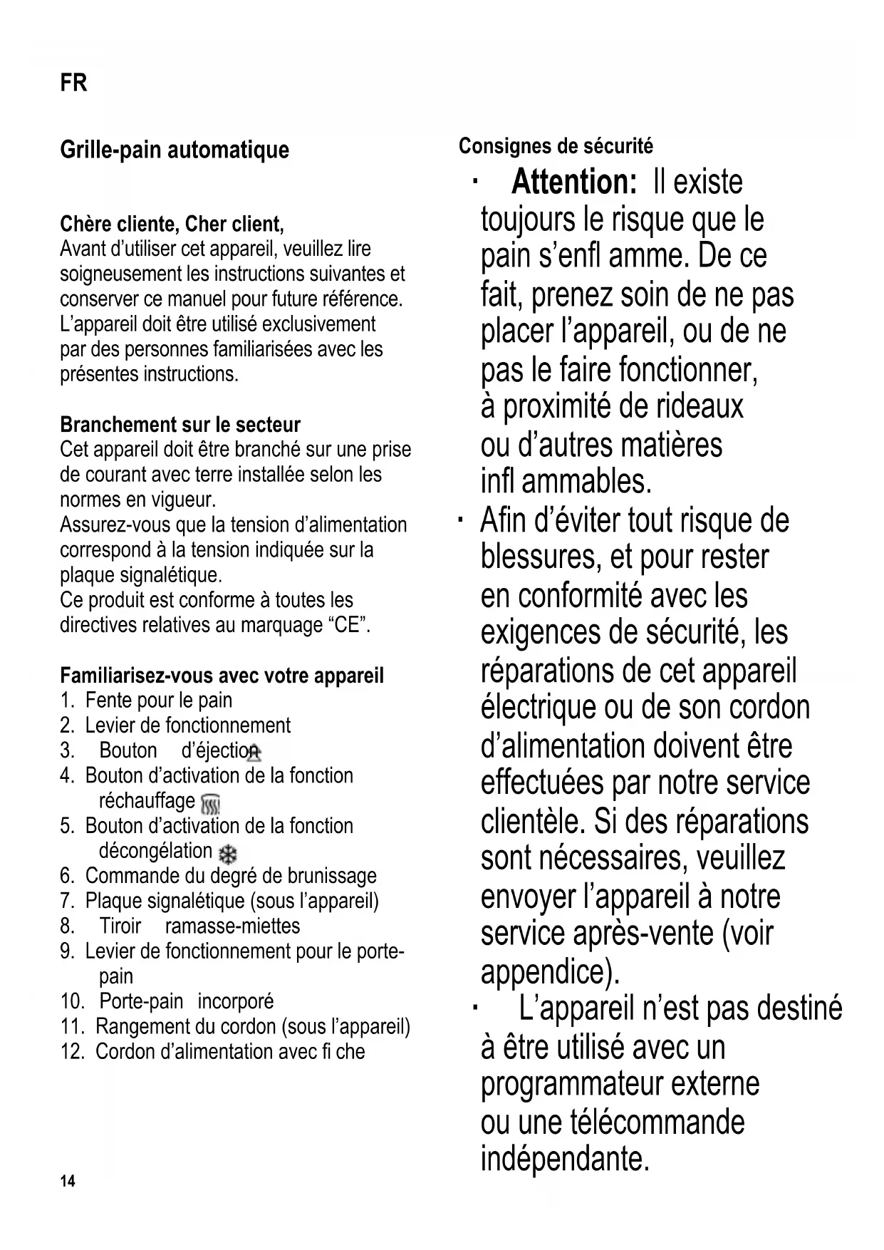 Consignes de sécurité ∙ Attention : Il existe toujours le risque que le pain s’enfl amme. De ce fait, prenez soin de ne pas placer l’appareil, ou de ne pas le faire fonctionner, à proximité de rideaux ou d’autres matières infl ammables. ∙ A fi n d’éviter tout risque de blessures, et pour rester en conformité avec les exigences de sécurité, les réparations de cet appareil électrique ou de son cordon d’alimentation doivent être effectuées par notre service clientèle. Si des réparations sont nécessaires, veuillez envoyer l’appareil à notre service après-vente (voir appendice). ∙ L’appareil n’est pas destiné à être utilisé avec un programmateur externe ou une télécommande indépendante. FR15 ∙ Débranchez toujours la fi che de la prise murale et laissez refroidir avant de nettoyer l’appareil. ∙ Pour éviter le risque de chocs électriques, ne pas nettoyer l’appareil avec du liquide et ne pas le plonger dans du liquide. ∙ Pour nettoyer le boîtier de l’appareil, il suffi t d’essuyer la surface extérieure avec un chiffon légèrement humide. ∙ Pour enlever les miettes, tirez le tiroir ramasse- miettes vers le côté et le vider. Assurez-vous de bien replacer le tiroir ramasse- miettes avant d’utiliser à nouveau l’appareil. ∙ Cet appareil est destiné à une utilisation domestique ou similaire, telle que - par des employés de magasins, de bureaux et d’autres environnements professionnels similaires, - dans des organisations agricoles, - par la clientèle dans les hôtels, motels et établissements similaires, - et dans des maisons d’hôtes. ∙ Cet appareil peut être utilisé par des enfants (à partir de 8 ans) et par des personnes souffrant de défi ciences physiques, sensorielles ou mentales, ou manquant d’expérience ou de connaissances, s’ils ont été formés à l’utilisation de l’appareil et ont été supervisés, et s’ils en comprennent les dangers et les précautions de sécurité à prendre. ∙ Les enfants ne sont pas autorisés à jouer avec l’appareil. ∙ Les enfants ne doivent pas être autorisés à nettoyer ou16 entretenir l’appareil à moins d’être supervisés et d’avoir plus de 8 ans. ∙ L’appareil et son cordon d’alimentation doivent être, à tout moment, tenus hors de portée des enfants de moins de 8 ans. ∙ Attention : Tenez les enfants à l’écart des emballages, qui représentent un risque potentiel, par exemple, de suffocation. ∙ Placez toujours l’appareil sur une surface plane et thermorésistante. ∙ Pour éviter d’endommager le boîtier, ne placez pas l’appareil sur, ou à proximité, des surfaces chaudes ou des sources de fl ammes telles plaques de cuisson ou brûleurs à gaz. ∙ Attention: Les surfaces de l’appareil deviennent très chaudes pendant l’utilisation. Danger de brûlures! ∙ Avant toute utilisation, vérifi ez soigneusement que l’appareil, son cordon d’alimentation et ses accessoires ne présentent aucun signe de détérioration qui pourrait avoir un effet néfaste sur la sécurité de fonctionnement de l’appareil. Au cas où l’appareil, par exemple, serait tombé sur une surface dure, ou si une force excessive aurait été employée pour tirer sur le cordon d’alimentation, il ne doit plus être utilisé. ∙ Ne laissez jamais l’appareil ou le cordon d’alimentation entrer en contact avec une surface chaude. ∙ Ne laissez pas pendre le cordon d’alimentation. ∙ Ne jamais faire fonctionner l’appareil sans surveillance. ∙ Ne recouvrez pas la fente à pain lorsque l’appareil est en marche. ∙ N’essayez pas d’enlever le pain du grille- pain avec les doigts ou d’introduire un objet quelconque (par exemple couteau, fourchette) dans la fente prévue pour le pain. Les éléments chauffants sont sous tension. ∙ Débranchez toujours la fi che de la prise murale - après l’emploi, - en cas de fonctionnement défectueux, - avant de nettoyer l’appareil. ∙ Ne débranchez pas l’appareil en tirant sur le cordon ; tirez toujours sur la fi che. ∙ Nous déclinons toute responsabilité pour les dommages éventuels subis par cet appareil, résultant d’une utilisation non-conforme aux instructions contenues dans ce manuel. Fonctionnement Informations générales ∙ Attention : Le levier de fonctionnement ne se bloque en bas que lorsque l’appareil est sous tension. ∙ Evitez d’utiliser des tranches trop épaisses ou trop grandes. Elles pourraient rester coincées dans le grille- pain. L’épaisseur des tranches à griller ne doit pas dépasser 14 mm. ∙ En cas de problèmes ou de mauvais fonctionnement, et avant de nettoyer l’appareil, enlevez toujours la fi che de la prise murale.17 ∙ Pour enlever une tranche bloquée dans la fente, utilisez une tige de bois arrondie (par exemple une poignée de brosse). Ne touchez jamais les résistances en métal. Avant la première mise en service ∙ Nettoyez le grille-pain à fond (voir Nettoyage et entretien). ∙ Mettez en marche le grille-pain sans y mettre de pain en le faisant effectuer 5 cycles de grillage à température maximale. ∙ Laissez refroidir le grille-pain entre les cycles de grillage. ∙ A la première mise en marche de l’appareil, une légère fumée et une faible odeur peuvent être dégagées. Ceux-ci disparaissent rapidement. Pour cette raison, assurez-vous que la ventilation est adéquate en ouvrant les fenêtres et les porte-fenêtres. Système de sécurité arrêt automatique Cet appareil comprend un système de sécurité arrêt automatique. Si une tranche de pain se coince dans le grille-pain et ne peut être éjectée après le brunissage, l’appareil s’éteint automatiquement. Dans ce cas, débranchez l’appareil de la prise murale et retirez la tranche de pain de la façon décrite au chapitre Informations générales. Réglage du degré de grillage Le degré de grillage est réglable à l’infi ni au moyen de la commande de 