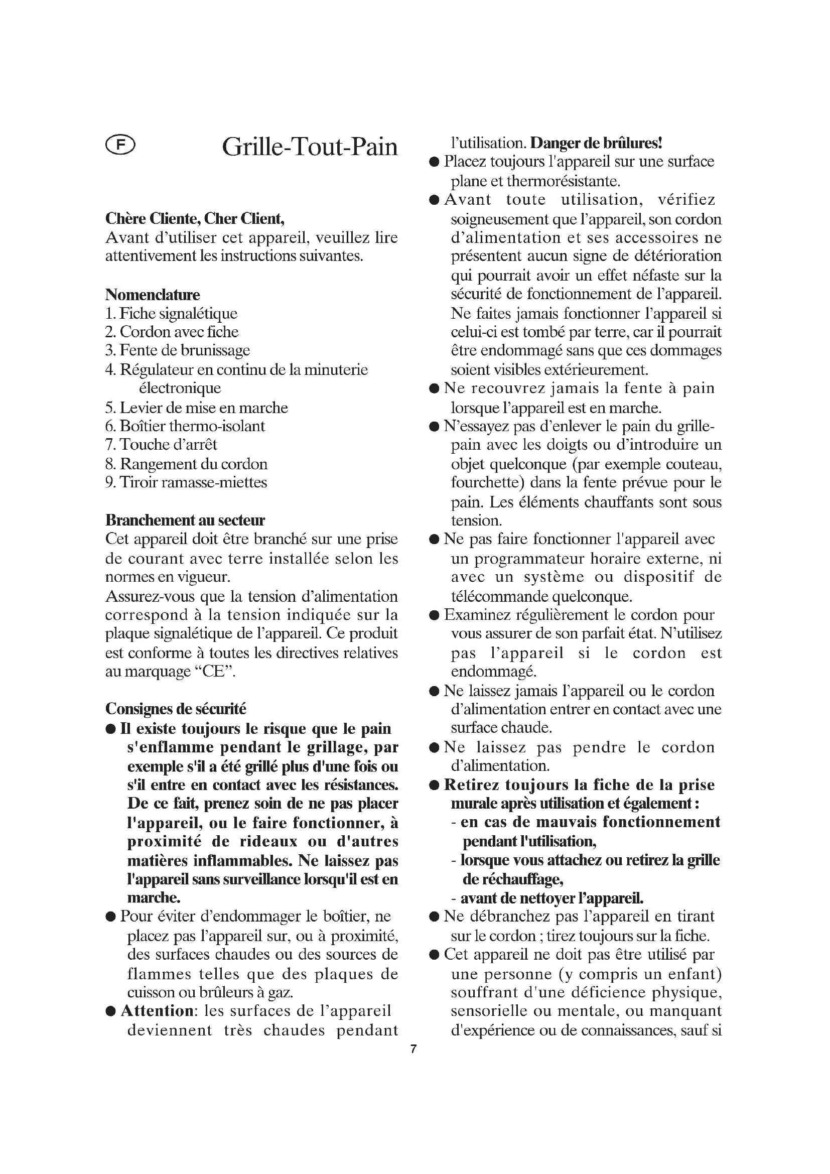 Branchement au secteur Cet appareil doit être branché sur une prise de courant avec terre installée selon les normes en vigueur. Assurez-vous que la tension d’alimentation correspond à la tension indiquée sur la plaque signalétique de l’appareil. Ce produit est conforme à toutes les directives relatives au marquage “CE”. Consignes de sécurité ● Il existe toujours le risque que le pain s'enflamme pendant le grillage, par exemple s'il a été grillé plus d'une fois ou s'il entre en contact avec les résistances. De ce fait, prenez soin de ne pas placer l'appareil, ou le faire fonctionner, à proximité de rideaux ou d'autres matières inflammables. Ne laissez pas l'appareil sans surveillance lorsqu'il est en marche. ● Pour éviter d’endommager le boîtier, ne placez pas l’appareil sur, ou à proximité, des surfaces chaudes ou des sources de flammes telles que des plaques de cuisson ou brûleurs à gaz. ● Attention: les surfaces de l’appareil deviennent très chaudes pendant l’utilisation. Danger de brûlures! ● Placez toujours l'appareil sur une surface plane et thermorésistante. ● Avant toute utilisation, vérifiez soigneusement que l’appareil, son cordon d’alimentation et ses accessoires ne présentent aucun signe de détérioration qui pourrait avoir un effet néfaste sur la sécurité de fonctionnement de l’appareil. Ne faites jamais fonctionner l’appareil si celui-ci est tombé par terre, car il pourrait être endommagé sans que ces dommages soient visibles extérieurement. ● Ne recouvrez jamais la fente à pain lorsque l’appareil est en marche. ● N’essayez pas d’enlever le pain du grille- pain avec les doigts ou d’introduire un objet quelconque (par exemple couteau, fourchette) dans la fente prévue pour le pain. Les éléments chauffants sont sous tension. ● Ne pas faire fonctionner l'appareil avec un programmateur horaire externe, ni avec un système ou dispositif de télécommande quelconque. ● Examinez régulièrement le cordon pour vous assurer de son parfait état. N’utilisez pas l’appareil si le cordon est endommagé. ● Ne laissez jamais l’appareil ou le cordon d’alimentation entrer en contact avec une surface chaude. ● Ne laissez pas pendre le cordon d’alimentation. ● Retirez toujours la fiche de la prise murale après utilisation et également : - en cas de mauvais fonctionnement pendant l'utilisation, - lorsque vous attachez ou retirez la grille de réchauffage, - avant de nettoyer l’appareil. ● Ne débranchez pas l’appareil en tirant sur le cordon ; tirez toujours sur la fiche. ● Cet appareil ne doit pas être utilisé par une personne (y compris un enfant) souffrant d'une déficience physique, sensorielle ou mentale, ou manquant d'expérience ou de connaissances, sauf si