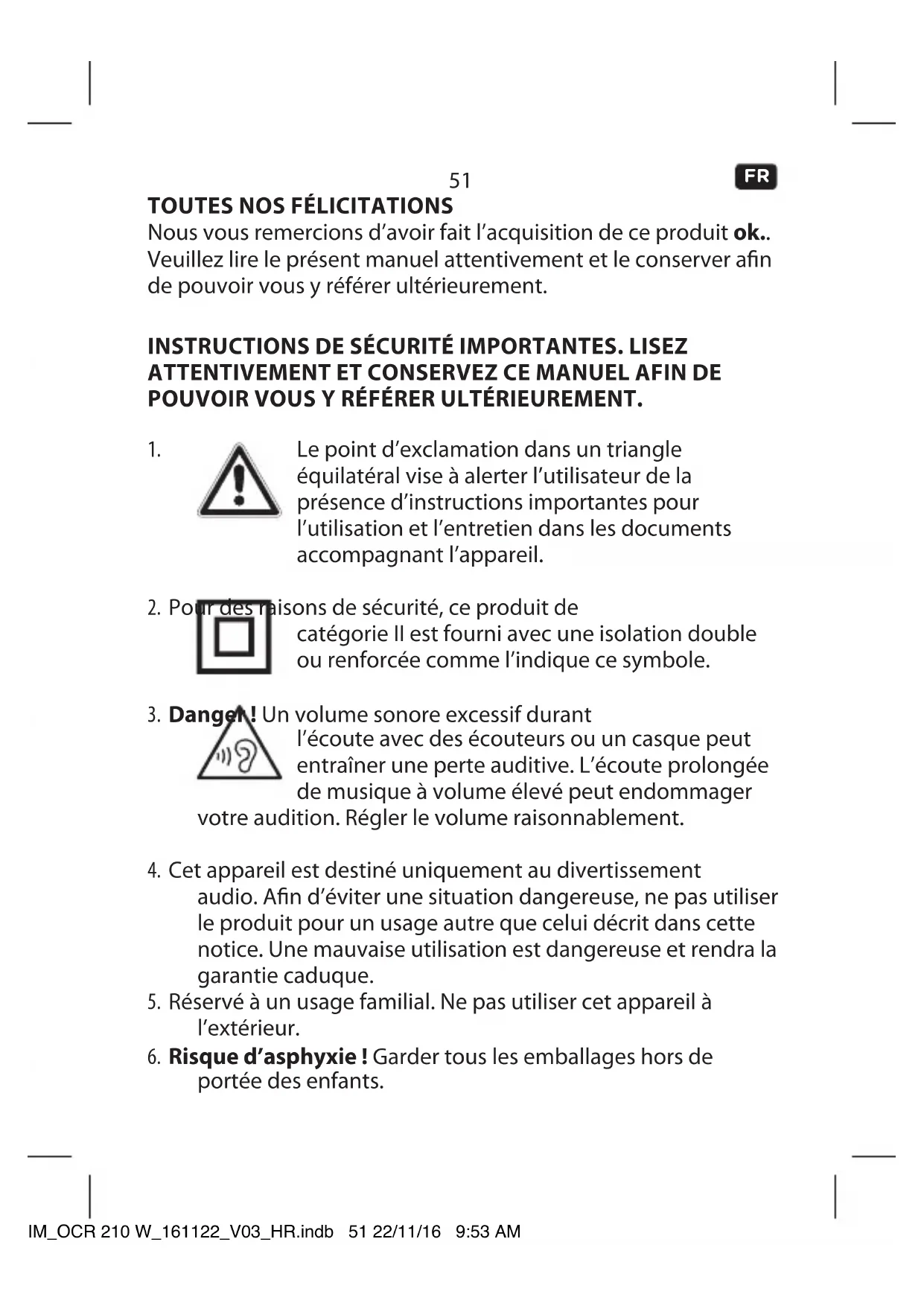 - Mettez l’appareil dans un autre endroit et réglez à nouveau l’antenne. IM_OCR 210 W_161122_V03_HR.indb 61 22/11/16 9:53 AM62
