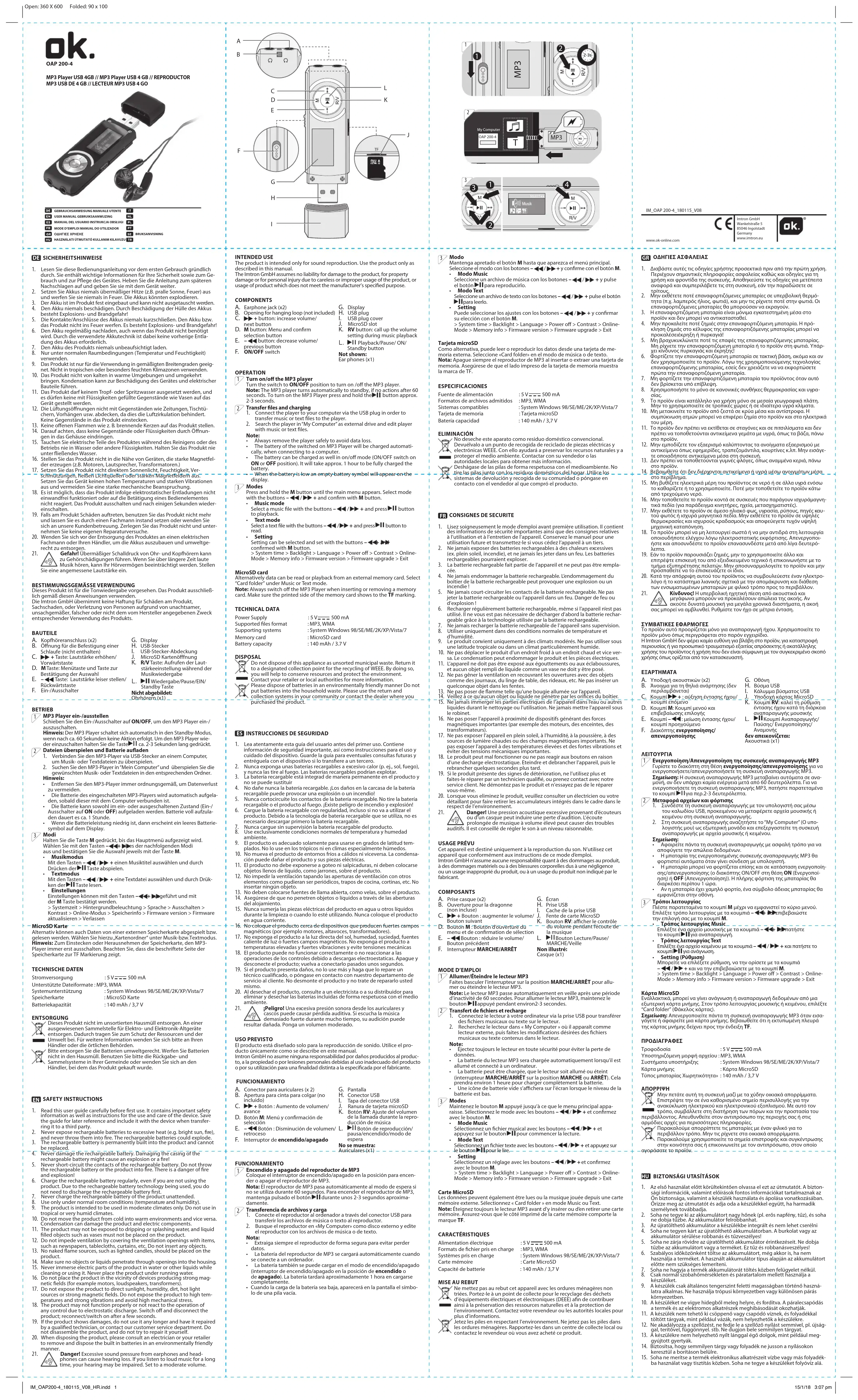 Cet appareil est destiné uniquement à la reproduction du son. N’utilisez cet appareil que conformément aux instructions de ce mode d’emploi. Imtron GmbH n’assume aucune responsabilité quant à des dommages au produit, à des dommages matériels ou à des blessures corporelles dus à une négligence ou un usage inapproprié du produit, ou à un usage du produit non indiqué par le fabricant. COMPOSANTS A. Prise casque (x2) B. Ouverture pour la dragonne (non incluse) C. + Bouton : augmenter le volume/ Bouton suivant D. Bouton M : Bouton d’ouverture du menu et de conrmation de sélection E. – Bouton : réduire le volume/ Bouton précédent F. Interrupteur MARCHE/ARRÊT G. Écran H. Prise USB
