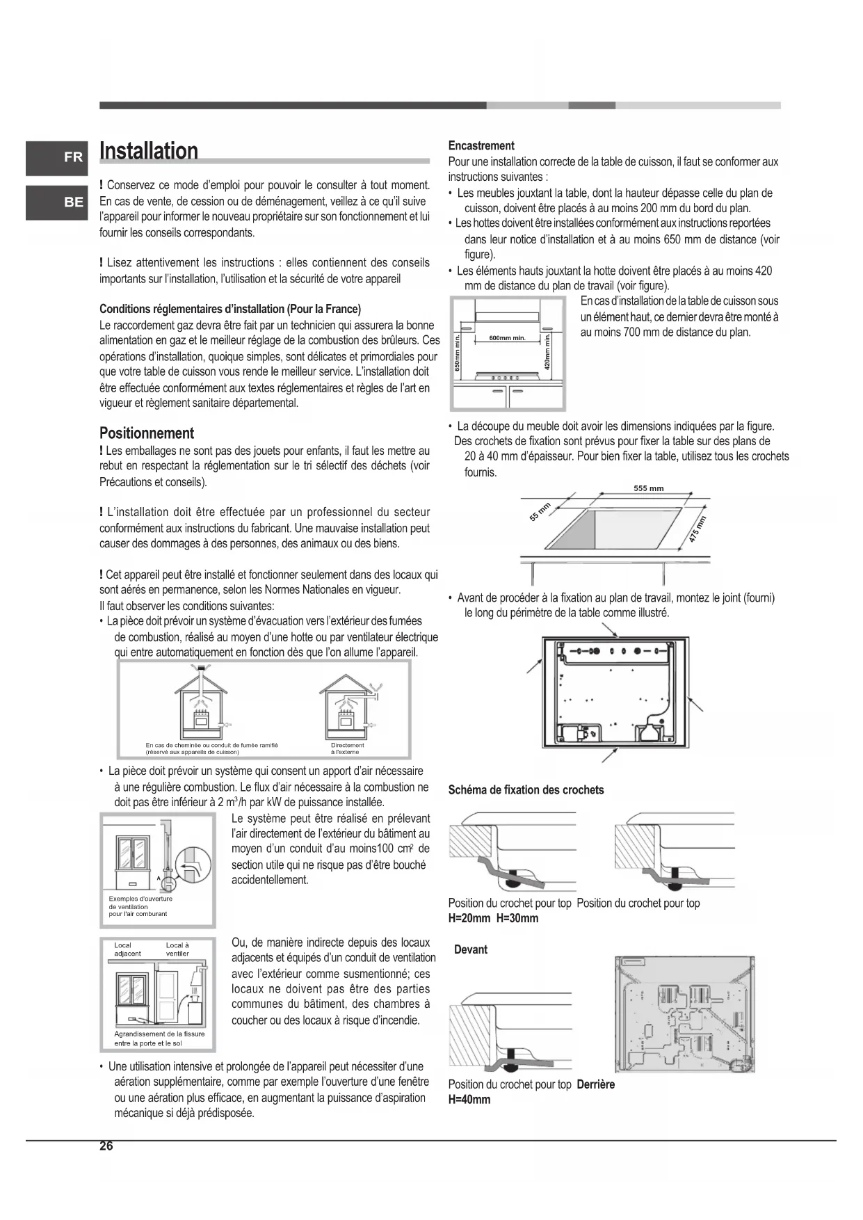 Exemples d'ouverturede ventilationpour l'air comburantAgrandissement de la fissureentre la porte et le solLocaladjacentLocal àventiler Encastrement Pour une installation correcte de la table de cuisson, il faut se conformer aux instructions suivantes :