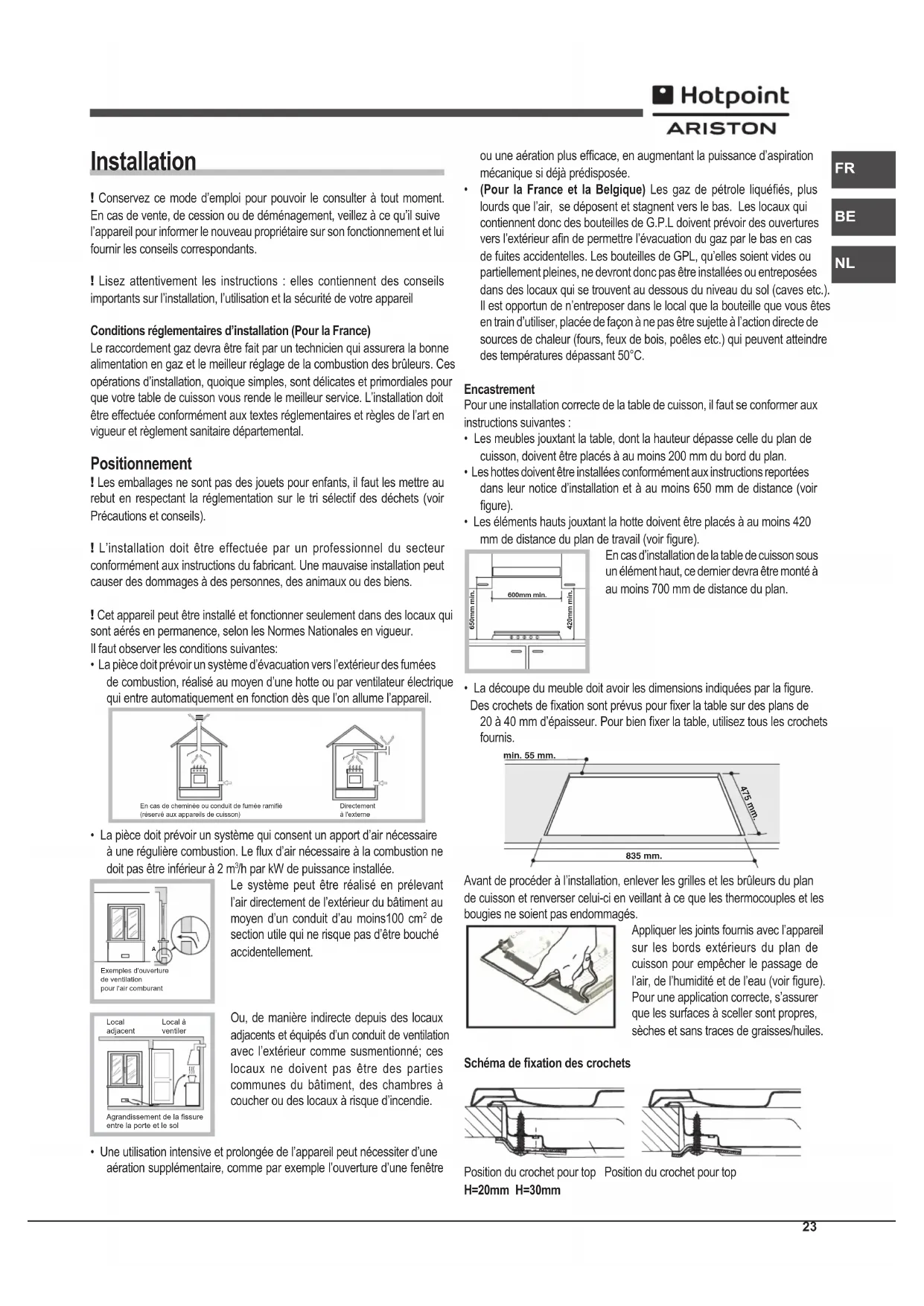 - La découpe du meuble doit avoir les dimensions indiquées par la gure. Des crochets de xation sont prévus pour xer la table sur des plans de 20 à 40 mm d’épaisseur. Pour bien xer la table, utilisez tous les crochets fournis. 475 mm. 835 mm. min. 55 mm. Avant de procéder à l’installation, enlever les grilles et les brûleurs du plan de cuisson et renverser celui-ci en veillant à ce que les thermocouples et les bougies ne soient pas endommagés. Appliquer les joints fournis avec l’appareil sur les bords extérieurs du plan de cuisson pour empêcher le passage de l’air, de l’humidité et de l’eau (voir gure). Pour une application correcte, s’assurer que les surfaces à sceller sont propres, sèches et sans traces de graisses/huiles. Schéma de xation des crochets Position du crochet pour top Position du crochet pour top H=20mm H=30mm 600mm min. 420mm min. 650mm min.24