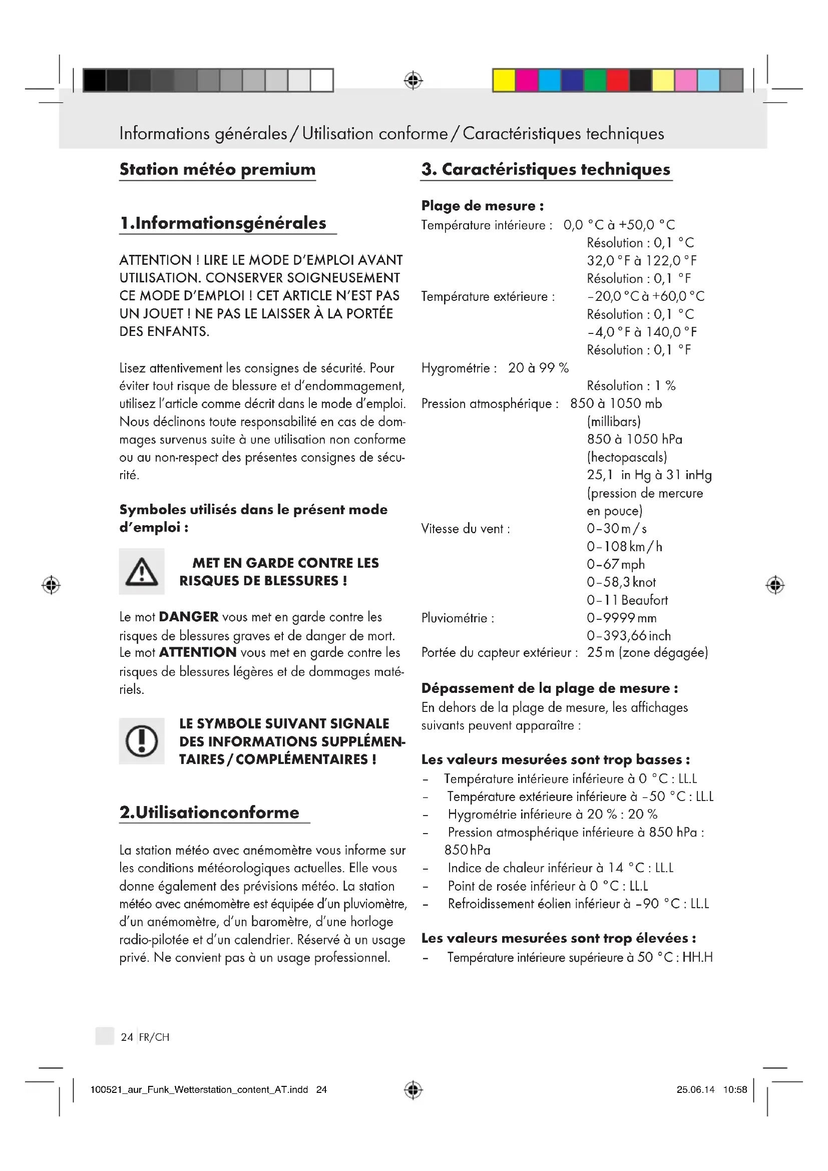 20. Réglage de l’unité de mesure du pluviomètre .......................................................................Page 38 21. Réglage de l’unité de température ......................................................................................... Page 38 22. Indications ................................................................................................................................Page 38 22.1 Date et heure ........................................................................................................................... Page 38 22.2 Fuseau horaire ......................................................................................................................... Page 38 22.3 Température et hygrométrie intérieures / extérieures .............................................................Page 38 22.4 Affichage de l’indice de chaleur et du point de rosée ..........................................................Page 39 22.5 Pluviométrie ..............................................................................................................................Page 39 22.6 Alarme gel / givre ....................................................................................................................Page 40 22.7 Direction du vent ......................................................................................................................Page 40 22.8 Vitesse du vent ......................................................................................................................... Page 40 22.9 Changement de pression atmosphérique .............................................................................. Page 40 22.10 Minima et maxima ..................................................................................................................Page 40 22.11 Prévisions météorologiques .....................................................................................................Page 40 22.12 Indication de tendance ........................................................................................................... Page 41 23. Entretien ...................................................................................................................................Page 41 23.1 Indication « faible état de charge » des piles ......................................................................Page 41 23.2 Filtre à feuilles du pluviomètre ................................................................................................Page 41 24. Dépannage en cas de résultats de mesure faux ................................................................... Page 41 25. Nettoyage ................................................................................................................................Page 42 26. Elimination ................................................................................................................................Page 42 Table des matières 100521_aur_Funk_Wetterstation_content_AT.indd 23 25.06.14 10:5824 FR/CH Informations générales / Utilisation conforme / Caractéristiques techniques Station météo premium