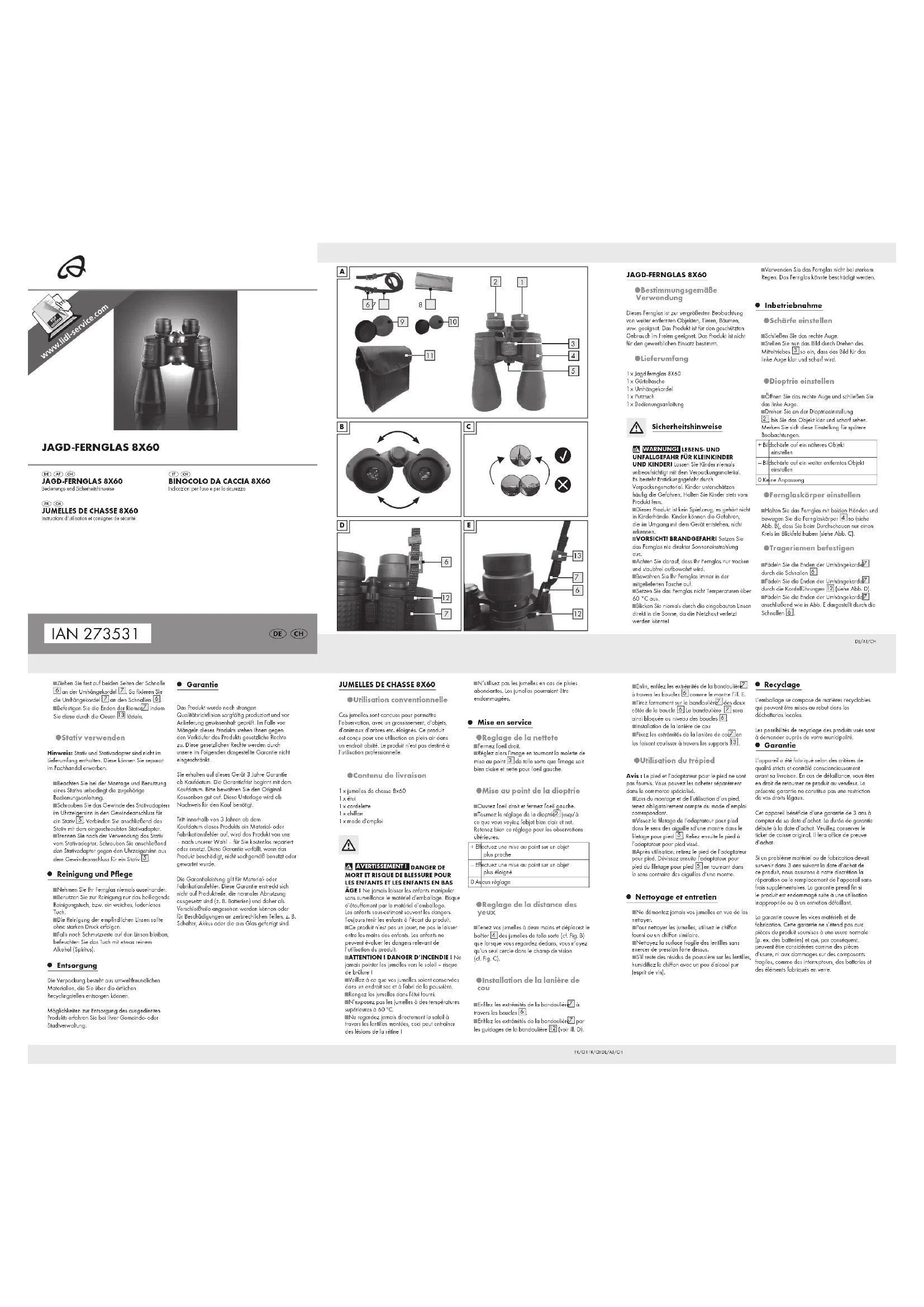 Garantie L’appareil a été fabriqué selon des critères de qualité stricts et contrôlé consciencieusement avant sa livraison. En cas de défaillance, vous êtes en droit de retourner ce produit au vendeur. La présente garantie ne constitue pas une restriction de vos droits légaux. Cet appareil bénéficie d‘une garantie de 3 ans à compter de sa date d’achat. La durée de garantie débute à la date d’achat. Veuillez conserver le ticket de caisse original. Il fera office de preuve d’achat. Si un problème matériel ou de fabrication devait survenir dans 3 ans suivant la date d‘achat de ce produit, nous assurons à notre discrétion la réparation ou le remplacement de l‘appareil sans frais supplémentaires. La garantie prend fin si le produit est endommagé suite à une utilisation inappropriée ou à un entretien défaillant. La garantie couvre les vices matériels et de fabrication. Cette garantie ne s’étend pas aux pièces du produit soumises à une usure normale (p. ex. des batteries) et qui, par conséquent, peuvent être considérées comme des pièces d’usure, ni aux dommages sur des composants fragiles, comme des interrupteurs, des batteries et des éléments fabriqués en verre. JAGD-FERNGLAS 8X60 IAN 273531 JAGD-FERNGLAS 8X60 Bedienungs- und Sicherheitshinweise
