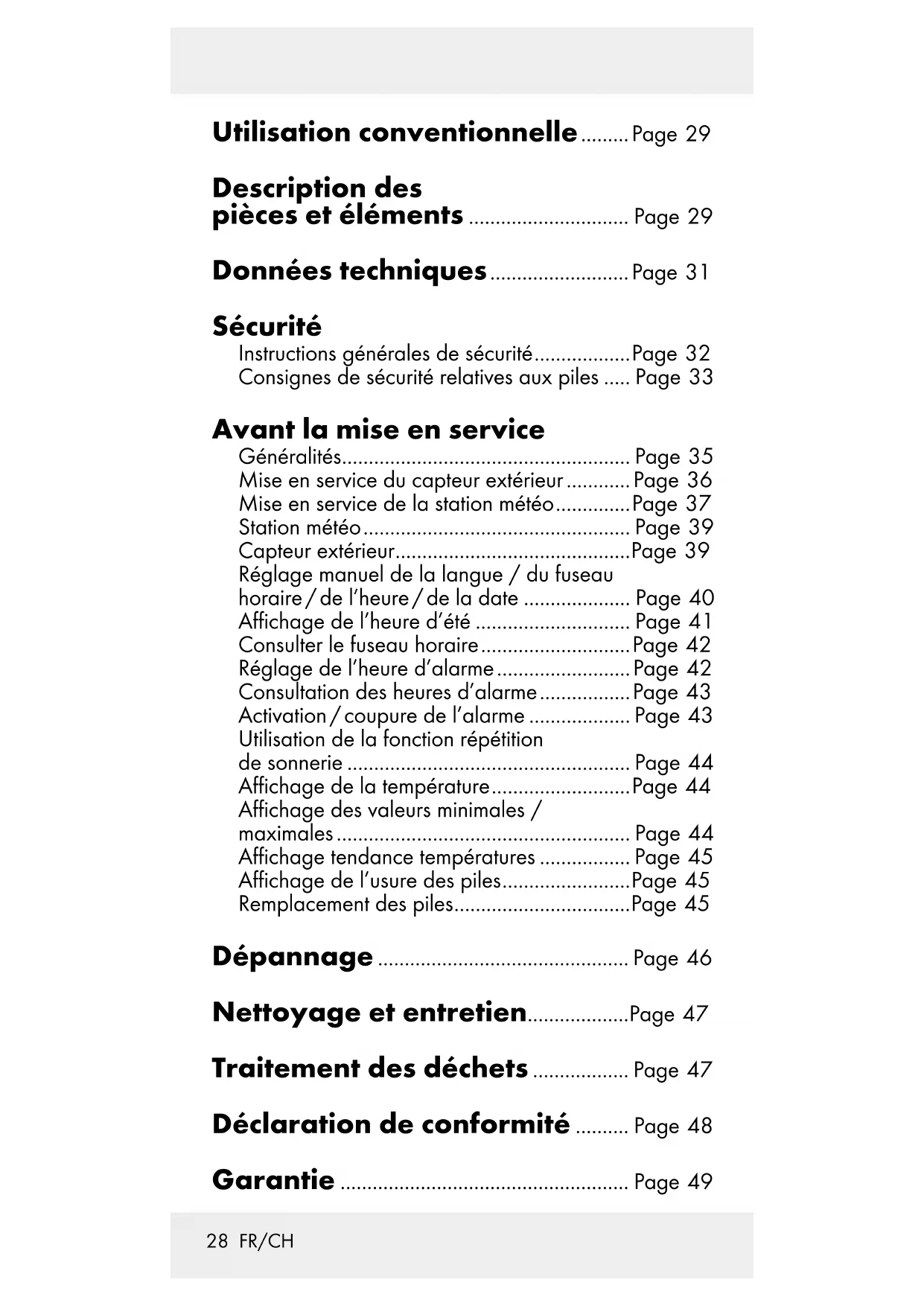 .46 FR/CH Retirez les piles usagées. Placez respectivement 2 piles neuves 1,5 V (AA) dans le boîtier à piles. Remarque: veillez à respecter la polarité. Celle-ci est indiquée dans le boîtier à piles (voir également Ill. C + E). Fermez les boîtiers à piles. Dépannage Remarque: cet appareil contient des compo- sants électroniques. Ne pas installer l’appareil à proximité de sources d’interférences telles que téléphones mobiles, appareils radio, postes CB, télécommandes ou fours à micro-ondes, etc. Éloigner ces appareils de la station météo et du capteur extérieur, ou retirer temporaire- ment les piles de la station ou du capteur si l’écran affiche des pannes. Les obstacles, comme par exemple les murs en béton, peuvent gêner la réception. Au besoin, changez l‘emplacement (par ex. près d’une fenêtre). Veuillez observer impérativement que le capteur extérieur est toujours installé dans un périmètre de max. 30 mètres (espace libre) de la base. La portée indiquée est la portée d‘espace libre et signifie qu‘il ne doit y avoir aucun obstacle entre le capteur extérieur et la base. Un „contact visuel“ entre le capteur extérieur et la base améliore sou- vent la transmission.47 FR/CH Le froid (températures extérieures inférieures à 0 °C) peut influencer la puissance de la batterie du cap- teur extérieur et ainsi réduire la transmission radio. Un autre facteur qui peut conduire à des troubles de réception sont les piles vides ou faibles du cap- teur extérieur. Échangez-les contre des nouvelles. Lorsque la station météo ne travaille pas correcte- ment, retirez les piles pendant un court moment et insérez-en de nouvelles. Nettoyage et entretien Nettoyez uniquement l’extérieur du boîtier à l’aide d’un chiffon doux et sec. Ne nettoyez pas le capteur extérieur en l’aspergeant, par exemple avec un tuyau d’arrosage. Le capteur extérieur n’est protégé de la pluie que du haut. Traitement des déchets L’emballage se compose exclusivement de matières recyclables qui peuvent être mises au rebut dans les déchetteries locales. Les possibilités de recyclage des produits usés sont à demander auprès de votre municipalité.48 FR/CH Afin de contribuer à la protection de l’environnement, veuillez ne pas jeter le produit usé dans les ordures ména- gères, mais le mettre au rebut de manière adéquate. Veuillez vous ren- seigner auprès des autorités respon- sables pour les déchetteries et leurs horaires d’ouverture. Les piles défectueuses ou usées doivent être recy- clées conformément à la directive 2006 / 66 / EC. Les piles et / ou l‘appareil doivent être retournés dans les centres de collecte.