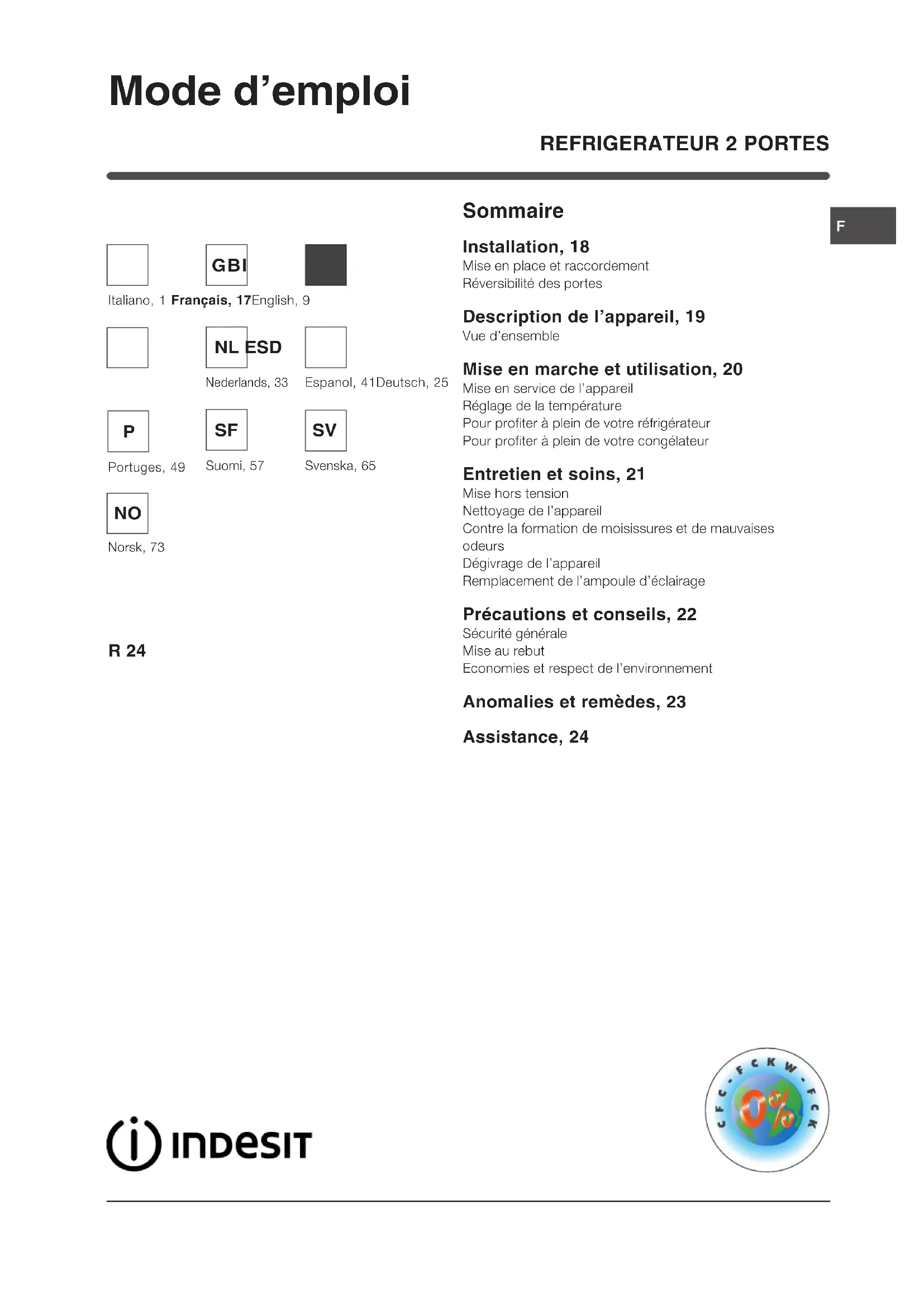 R 24 (EU) (0) - Réfrigérateur INDESIT - Notice d'utilisation et mode d'emploi gratuit