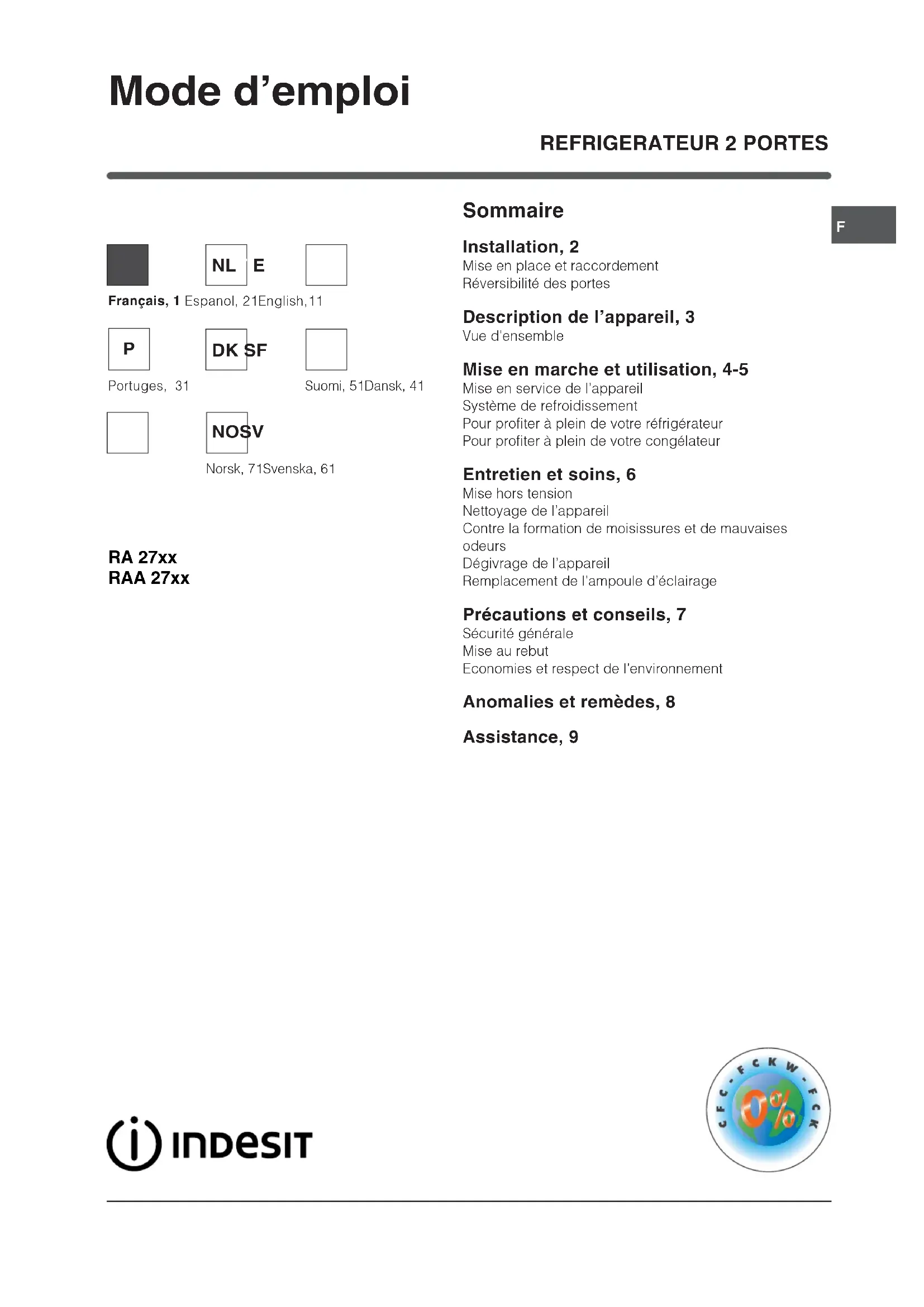 RAA 27 IX (0) - Réfrigérateur INDESIT - Notice d'utilisation et mode d'emploi gratuit