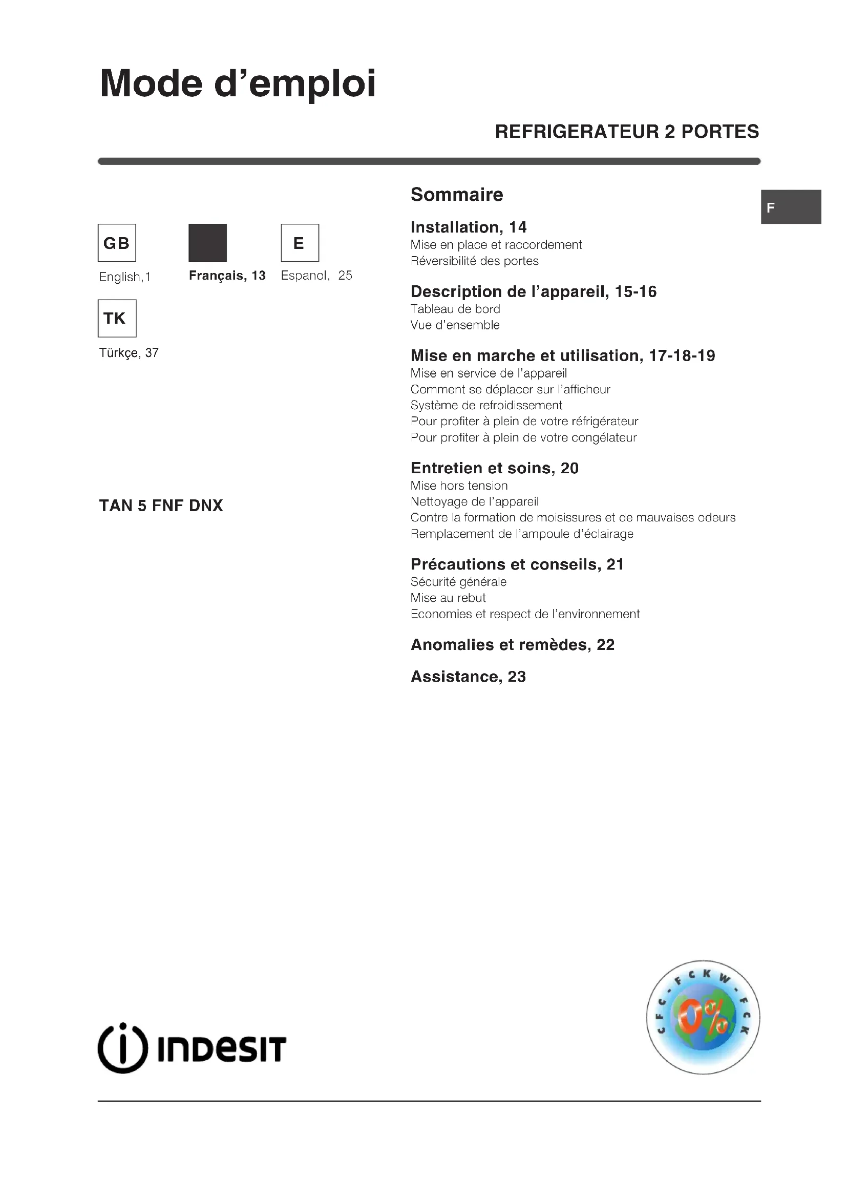 TAN 5 FNF DNX (TK) - Réfrigérateur INDESIT - Notice d'utilisation et mode d'emploi gratuit