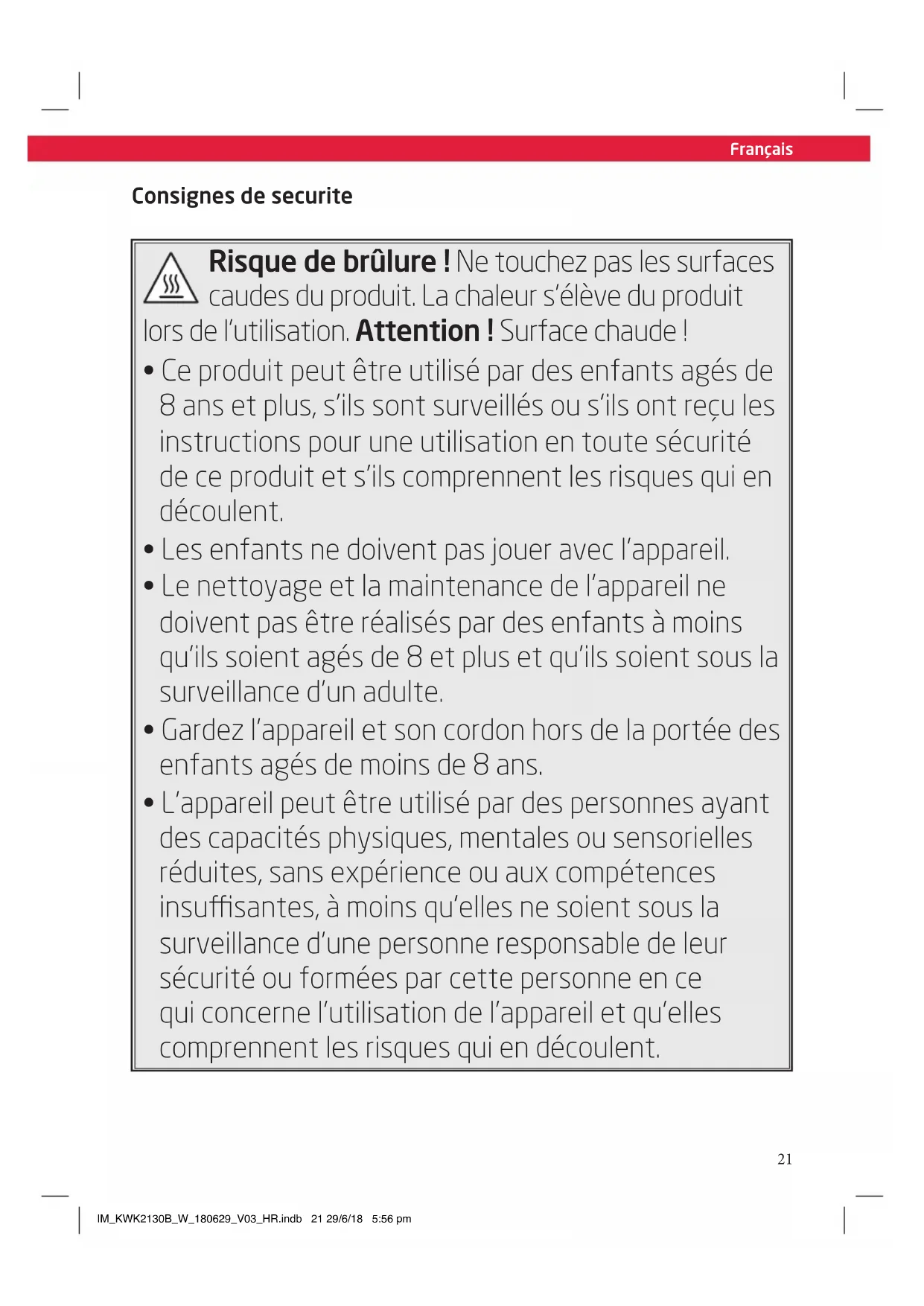- L'appareil peut être utilisé par des personnes ayant des capacités physiques, mentales ou sensorielles réduites, sans expérience ou aux compétences insuffisantes, à moins qu'elles ne soient sous la surveillance d'une personne responsable de leur sécurité ou formées par cette personne en ce qui concerne l'utilisation de l'appareil et qu'elles comprennent les risques qui en découlent.