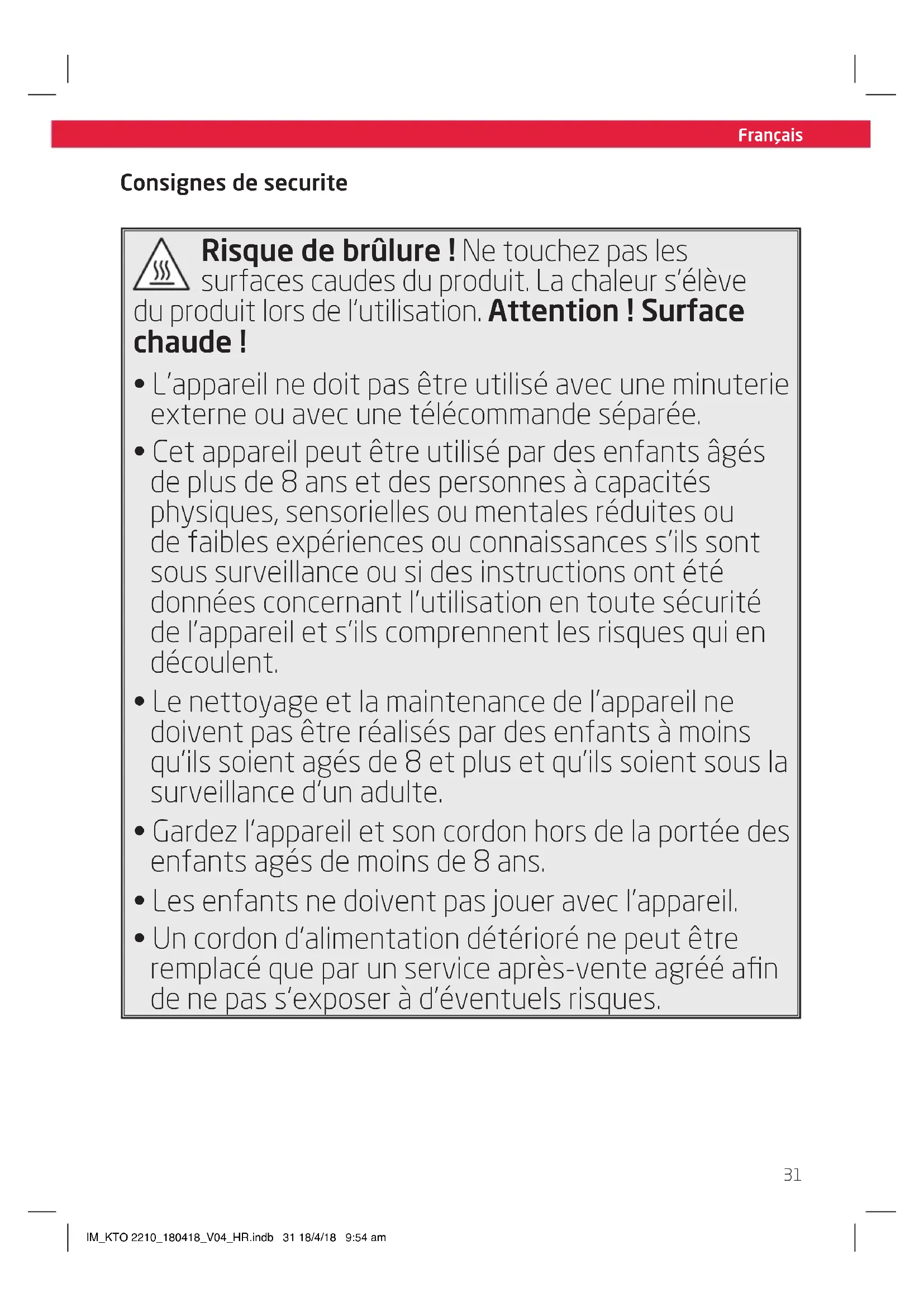 - Un cordon d’alimentation détérioré ne peut être remplacé que par un service après-vente agréé afin de ne pas s’exposer à d’éventuels risques. IM_KTO 2210_180418_V04_HR.indb 31 18/4/18 9:54 amFrançais