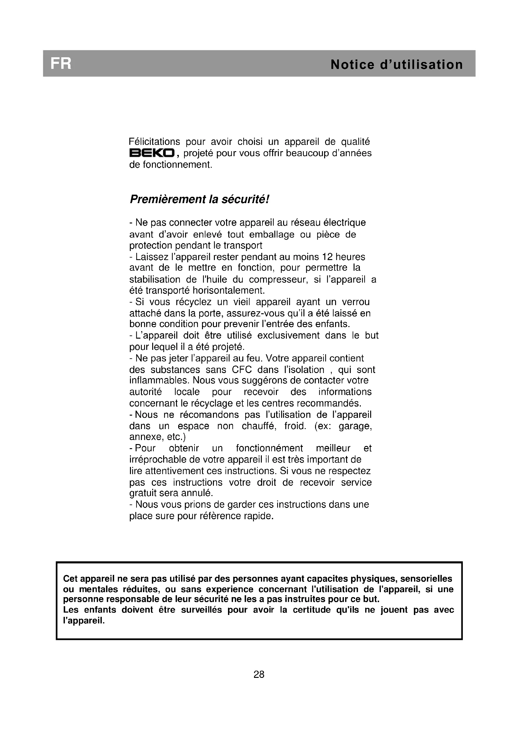 Cet appareil ne sera pas utilisé par des personnes ayant capacites physiques, sensorielles ou mentales réduites, ou sans experience concernant l'utilisation de l'appareil, si une personne responsable de leur sécurité ne les a pas instruites pour ce but. Les enfants doivent être surveillés pour avoir la certitude qu'ils ne jouent pas avec l'appareil.FR Notice d’utilisation Avertissements et conseils importants Il est très important que cette notice d'utilisation soit gardée avec l'appareil pour toute future consultation. Si cet appareil devait être vendu ou transféré à une autre personne, assurez-vous que la notice suive l'appareil de façon à ce que le nouvel utilisateur puisse être informé du fonctionnement de celui-ci et des avertissements relatifs. Ces avertissements sont donnés pour votre sûreté et pour celle d'autrui. Nous vous prions donc de bien vouloir les lire attentivement avant d'installer et d'utiliser votre réfrigérateur. Sûreté Cet appareil a été conçu pour être utilisé par des adultes. Veillez donc à ce que les enfants n'y touchent pas ou qu'ils l'utilisent comme un jouet. Débranchez toujours la prise de courant avant de procéder au nettoyage intérieur et au remplacement de la lampe d'éclairage. Cet appareil est lord; faites attention lors d'un déplacement. Service / réparation Il est dangereux de modifier ou d'essayer de modifier les caractéristiques de cet appareil. En cas de panne, n'essayez pas de réparer l'appareil vous-même. Les réparations effectuées par du personnel non qualifié peuvent provoquer des dommages. Contactez le service après vente de votre revendeur et exigez des pièces détachées d'origine. Si le cordon d’alimentation est endommagé, celui-ci doit être remplacé par le fabricant, ses agents agréés ou tout autre agent qualifié afin d'être à l'abri de tout danger. Utilisation Les réfrigérateurs ménagers sont destinés uniquement a la conservation des aliments et des boissons. Installation Assurez-vous qu'après avoir installé l'appareil, celui-ci ne repose pas sur le câble d'alimentation. L'appareil chauffe sensiblement au niveau du condenseur et du compresseur. Veillez a ce que l'air circule librement autour de l'appareil. Une ventilation insuffisante entraînerait un mauvais fonctionnement et une augmentation de la consommation d'électricité. Si l'appareil a été transporté couché, il est recommandé d'attendre environ 12 heure avant de la brancher. Installation Si cet appareil, muni d'une fermeture magnétique, doit être employé pour en remplacer une autre muni d'une fermeture à ressort, nous vous conseillons de rendre cette dernière inutilisable avant de mettre l'ancien appareil au rebut. Cela dans le but d'éviter que des enfants puissent s'y enfermer et mettre ainsi leur vie en danger. Emplacement Placez de préférence votre appareil loin d'une source de chaleur (chauffage, cuisson, rayons solaires trop intenses). Pour le bon fonctionnement de votre appareil, la température ambiante du local doit être comprise entre +10
