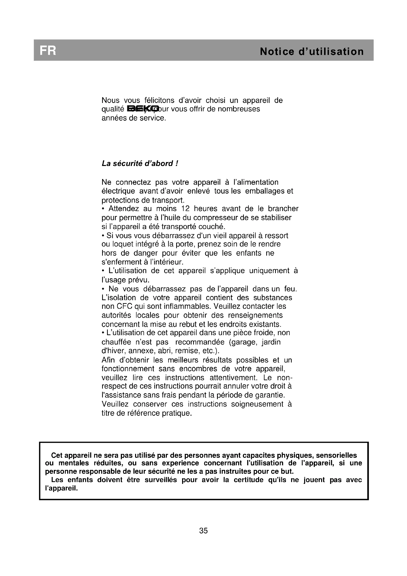 Cet appareil ne sera pas utilisé par des personnes ayant capacites physiques, sensorielles ou mentales réduites, ou sans experience concernant l'utilisation de l'appareil, si une personne responsable de leur sécurité ne les a pas instruites pour ce but. Les enfants doivent être surveillés pour avoir la certitude qu'ils ne jouent pas avec l'appareil.