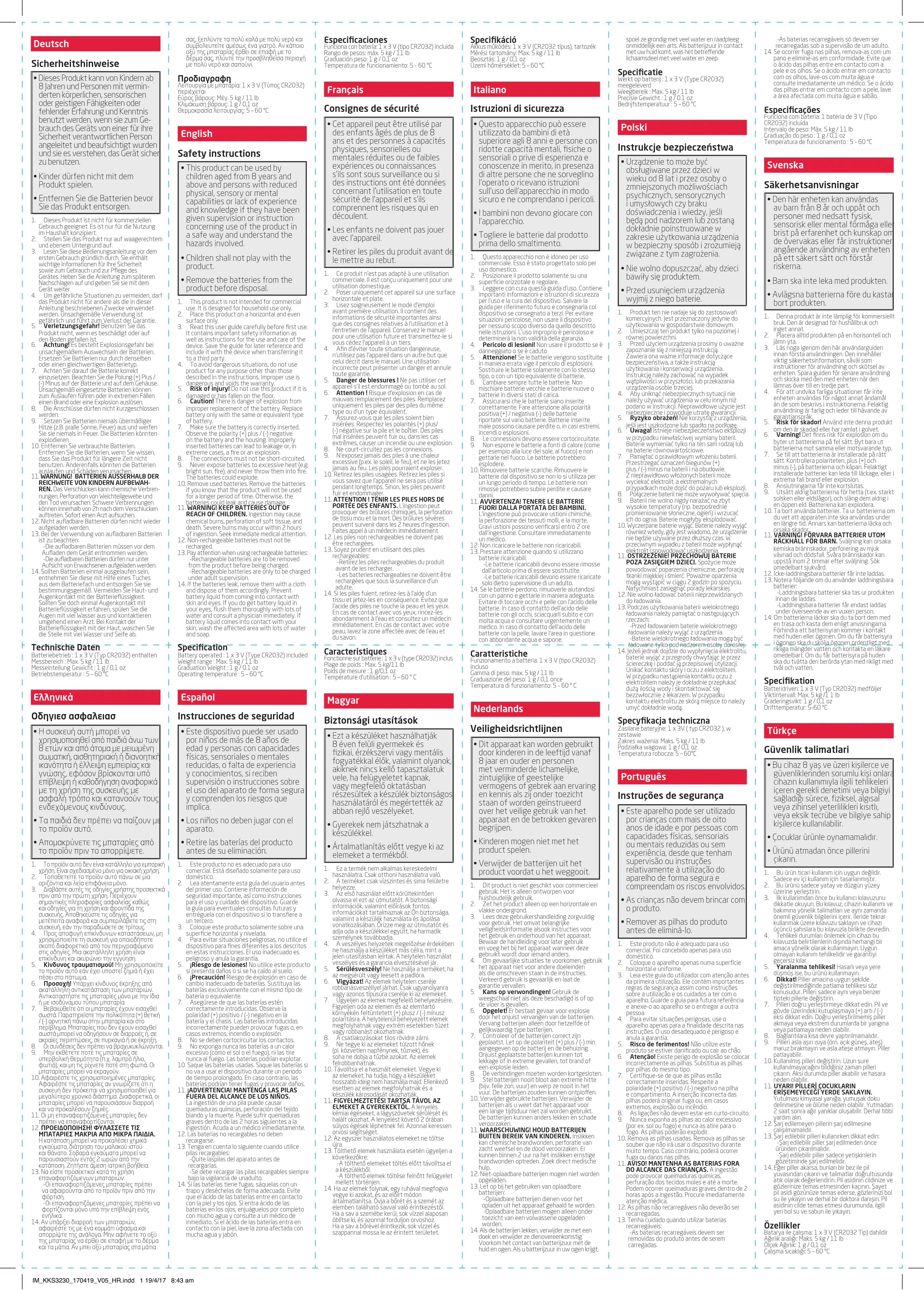 PORTÉE DES ENFANTS.L’ingestionpeut provoquerdesbrûlureschimiques,laperforation detissumouetlamort.Desbrûluressévères peuventsurvenirdansles2heuresd’ingestion. Faitesappelàunmédecinimmédiatement. 12.Lespilesnonrechargeablesnedoiventpas êtrerechargées. 13.Soyezprudentenutilisantdespiles rechargeables: - Retirezlespilesrechargeablesduproduit avantdelesrecharger. - Lesbatteriesrechargeablesnedoiventêtre rechargéesquesouslasurveillanced’un adulte. 14.Silespilesfuient,retirez-lesàl’aided’un tissuetjetez-lesenconséquence.Évitezque l’acidedespilesnetouchelapeauetlesyeux. Encasdecontactavecvosyeux,rincez-les abondammentàl’eauetconsultezunmédecin immédiatement.Encasdecontactavecvotre peau,lavezlazoneaectéeavecdel’eauet dusavon. Caracteristiques Fonctionnesurbatterie:1x3v(typeCR2032)inclus Plagedepoids:Max.5kg/11lb Poidsdemesure:1g/0,1oz Températured’utilisation:5–60°C Magyar Biztonsági utasítások