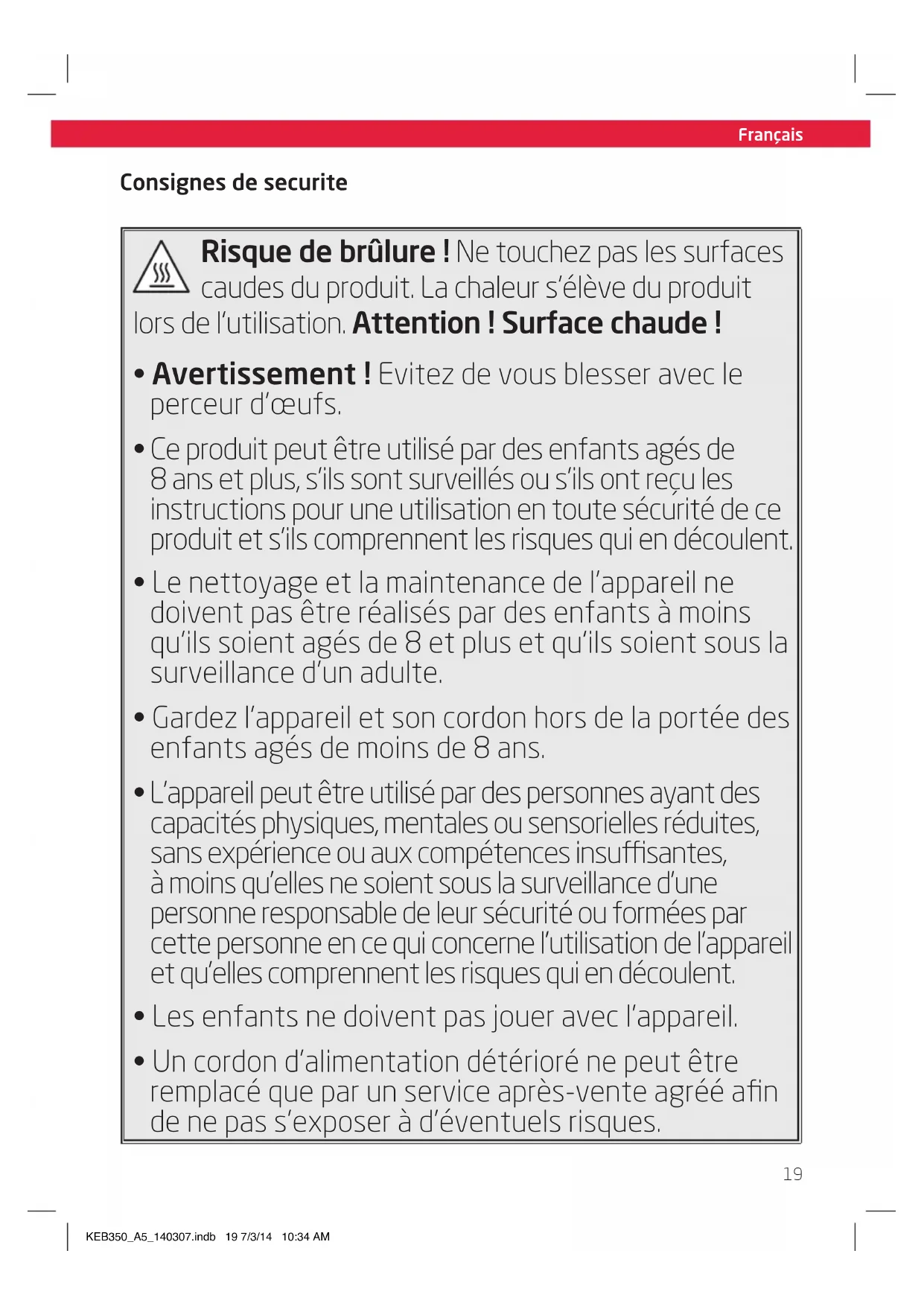 - Le nettoyage et la maintenance de l'appareil ne doit pas etre realizedes par des enfants a moins quils soient ages de 8 et plus et quils soient sous la surveillance d'un adulte.