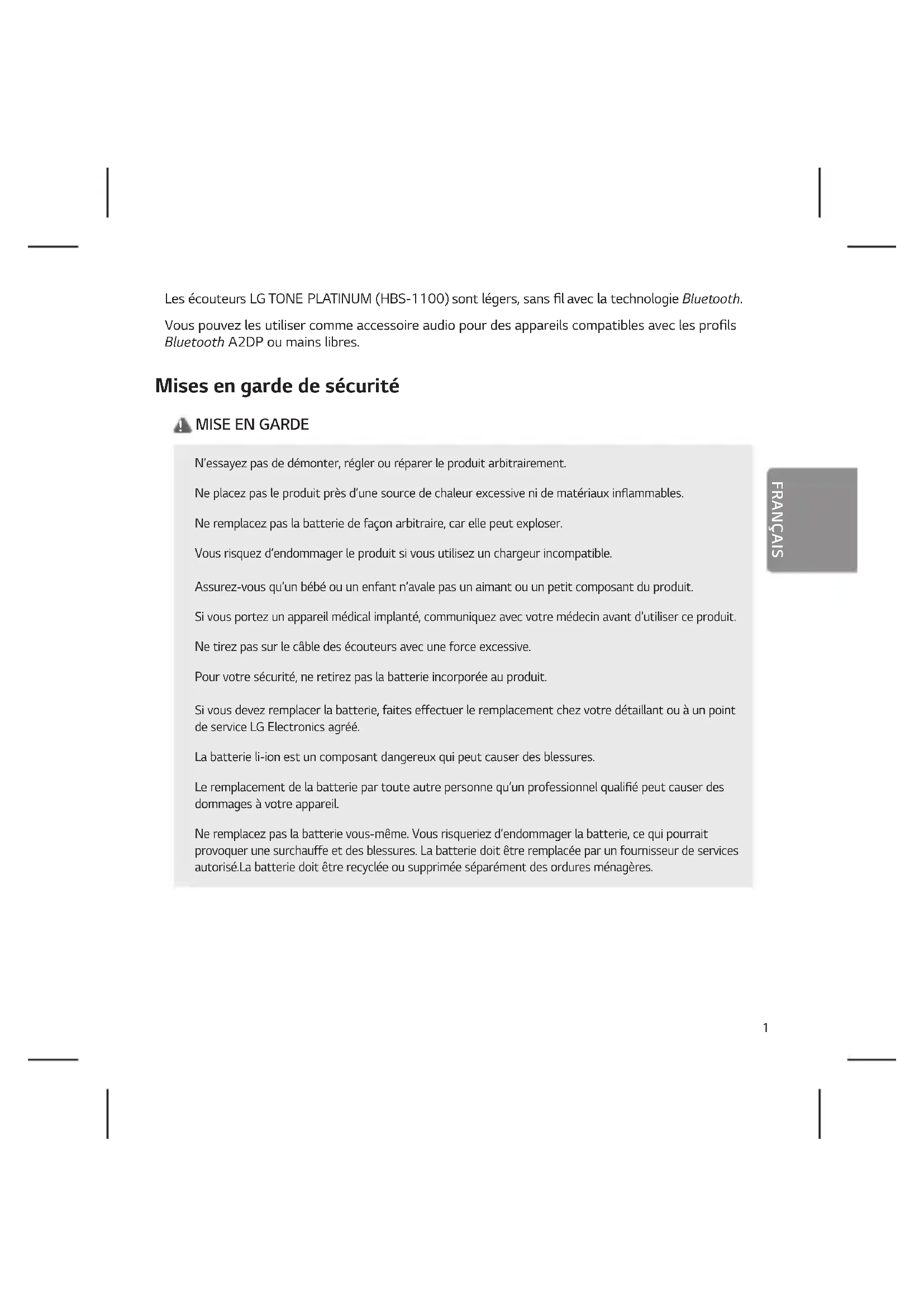 - Certaines fonctions peuvent consommer plus d’énergie et faire varier la durée réelle.15 FRANÇAIS Attestation de conformité INFORMATIONS RELATIVES À LA RÉGLEMENTATION FCC: Cet appareil est conforme à la partie 15 du règlement de la FCC et aux normes CNR d’IC applicables aux dispositifs exempts de licence. Son fonctionnement est sujet aux deux conditions suivantes: (1) Cet appareil ne doit pas provoquer d’interférences nuisibles et (2) Cet appareil doit accepter toutes les interférences reçues, y compris celles pouvant causer un fonctionnement indésirable. Les changements ou modications non approuvés expressément par le fabricant (ou l’autorité responsable de la conformité) peuvent annuler l’autorisation accordée à l’utilisateur d’utiliser l’équipement. Énoncé de la partie 15.105 des règlements de la FCC Cet équipement a été testé et jugé conforme aux limites relatives aux appareils numériques de catégorie B imposées par le paragraphe 15 de la réglementation de la FCC. Ces limites sont établies pour fournir une protection raisonnable contre les interférences nuisibles en installation résidentielle. Cet équipement génère, utilise et peut diffuser de l’énergie de radi- ofréquences et, s’il n’est pas installé et utilisé conformément aux instructions, peut causer des interférences nuisibles aux communications radio. Cependant, il n’existe aucune garantie qu’il n’y aura pas d’interférences dans une installation particulière. Si cet équipement cause des interférences nuisibles à la réception radio ou télévision (pour s’en assurer, il suft d’éteindre et de rallumer l’appareil), l’utilisateur est invité à essayer de corriger les interférences par l’une ou plusieurs des mesures suivantes : - Réorienter ou déplacer l’antenne de réception. - Augmenter la distance entre l’équipement et le récepteur. - Brancher l’équipement sur un circuit électrique distinct de celui qui alimente le récepteur. - Consulter le distributeur ou un technicien radio/télé qualié pour vous aider. REMARQUE IMPORTANTE: An de respecter les exigences de conformité de la FCC concernant l’exposition aux fréquences radio, aucun changement de l’antenne ou de l’appareil n’est autorisé. Tout changement apporté à l’antenne ou à l’appareil pourrait entraîner une augmentation de l’exposition aux fréquences radio du système et annuler le droit d’utiliser cet appareil.16 FRANÇAIS ATTESTATION DE CONFORMITÉ : LG Electronics déclare par la présente que ce produit HBS-1100 est conforme aux exigences essentielles et autres dispositions pertinentes de la directive1999/5/EC. L’attestation de conformité peut être consultée à l’adresse http://www.lg.com/global/declaration INFORMATIONS RELATIVES À LA RÉGLEMENTATION IC : Le présent appareil est conforme aux CNR d’Industrie Canada applicables aux appareils radio exempts de licence. L’exploitation est autorisée aux deux conditions suivantes : (1) l’appareil ne doit pas produire de brouillage; (2) l’utilisateur de l’appareil doit accepter tout brouillage radioélectrique subi, même si le brouillage est susceptible d’en compromettre le fonctionnement. Conformément à la réglementation d’Industrie Canada, le présent émetteur radio peut fonctionner avec une antenne d’un type et d’un gain maximal (ou inférieur) approuvé pour l’émetteur par Industrie Canada. Dans le but de réduire les risques de brouillage radioélectrique à l’intention des autres utilisateurs, il faut choisir le type d’antenne et son gain de sorte que la puissance isotope rayonnée quivalente (p.i.r.e.) ne dépassepas l’intensité nécessaire à l’établissement d’une communication satisfaisante. Exposición a RF Este equipo cumple con los límites de exposición a la radiación establecidos por la IC para entornos no controlados. Bluetooth® est une marque déposée de Bluetooth SIG, Inc. dans le monde entier. Qualcomm® aptX™ audio est un produit de Qualcomm Technologies International, Ltd.