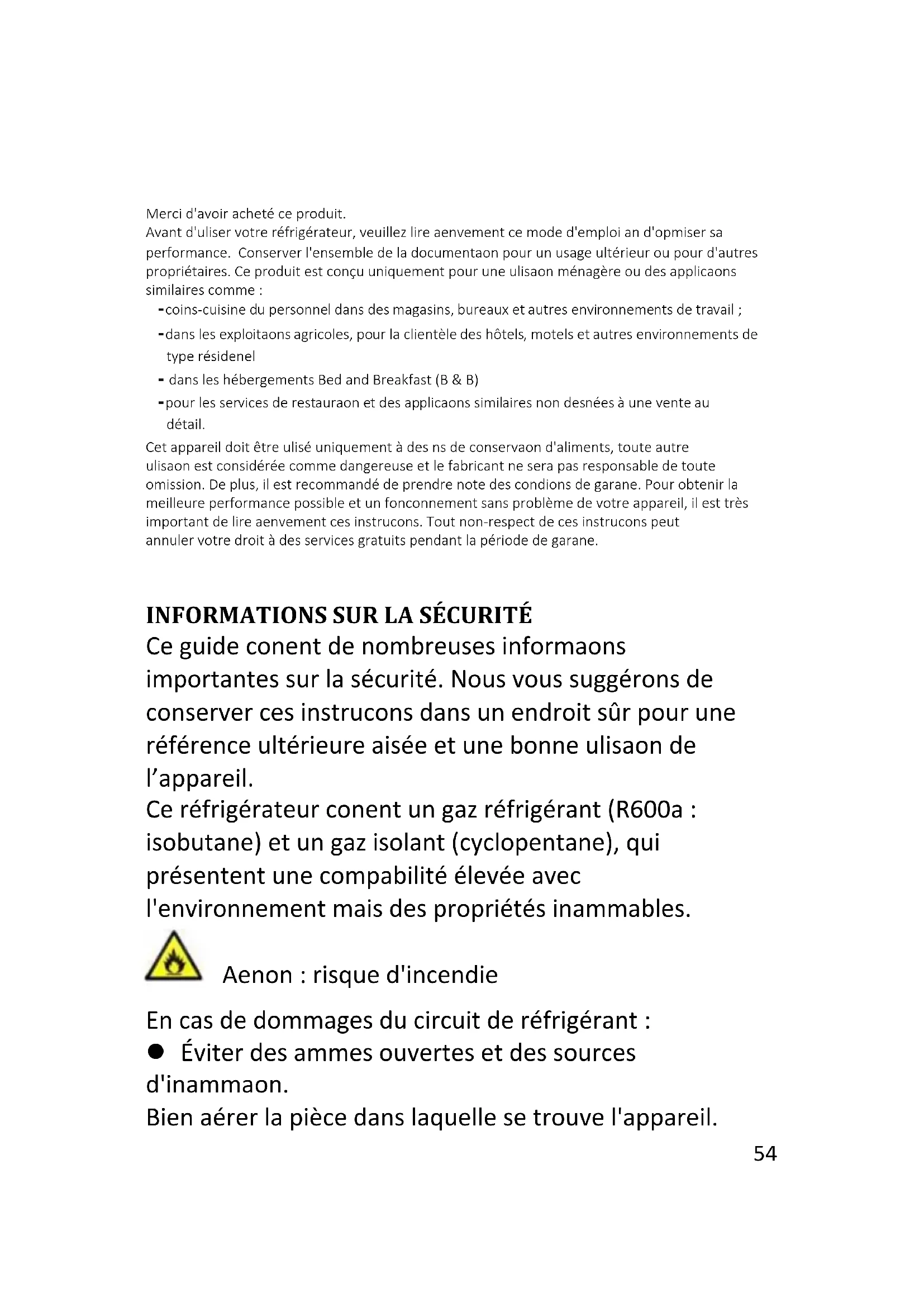 Merci d'avoir acheté ce produit. Avant d'utiliser votre réfrigérateur, veuillez lire attentivement ce mode d'emploi afin d'optimiser sa performance. Conserver l'ensemble de la documentation pour un usage ultérieur ou pour d'autres propriétaires. Ce produit est conçu uniquement pour une utilisation ménagère ou des applications similaires comme : - coins-cuisine du personnel dans des magasins, bureaux et autres environnements de travail ; - dans les exploitations agricoles, pour la clientèle des hôtels, motels et autres environnements de type résidentiel - dans les hébergements Bed and Breakfast (B & B) - pour les services de restauration et des applications similaires non destinées à une vente au détail. Cet appareil doit être utilisé uniquement à des fins de conservation d'aliments, toute autre utilisation est considérée comme dangereuse et le fabricant ne sera pas responsable de toute omission. De plus, il est recommandé de prendre note des conditions de garantie. Pour obtenir la meilleure performance possible et un fonctionnement sans problème de votre appareil, il est très important de lire attentivement ces instructions. Tout non-respect de ces instructions peut annuler votre droit à des services gratuits pendant la période de garantie.