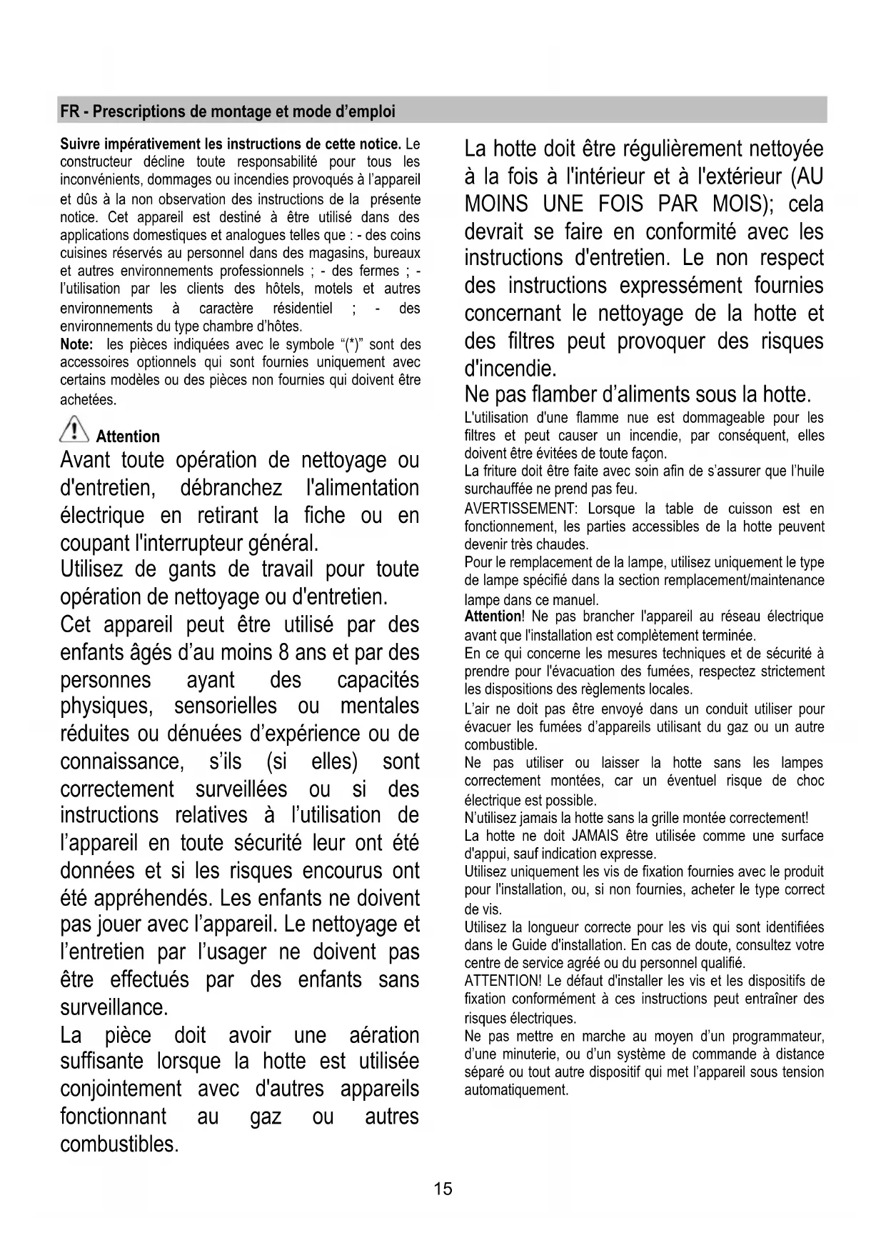 | Filtre à graisse | Filtre métallique, lavable au lave-vaisselle |