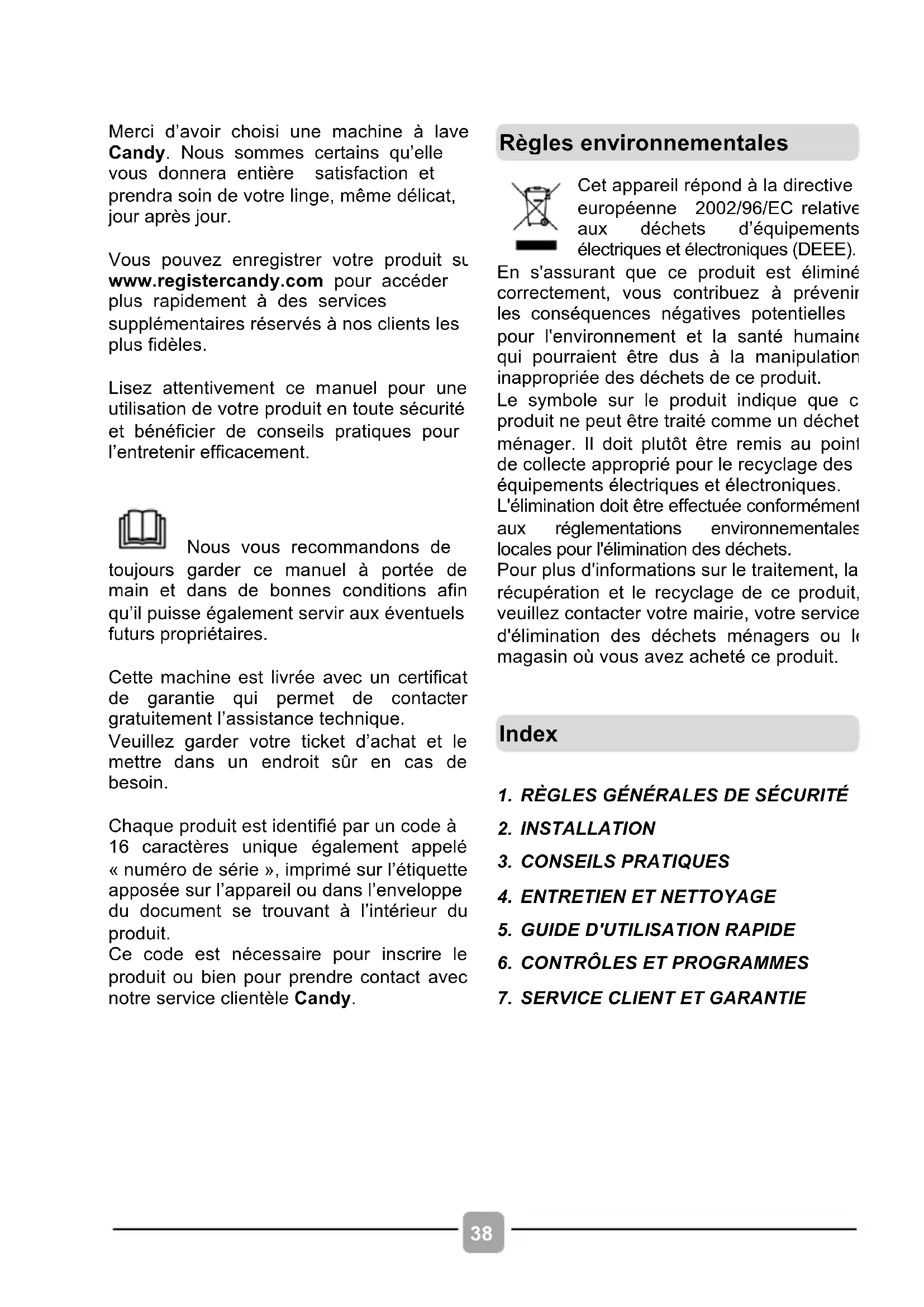 Merci d'avoir acheté une machine à laver Candy. Nous sommes certains qu'elle vous donnera entière satisfaction et prendra soin de votre linge, même délicat, jour après jour.