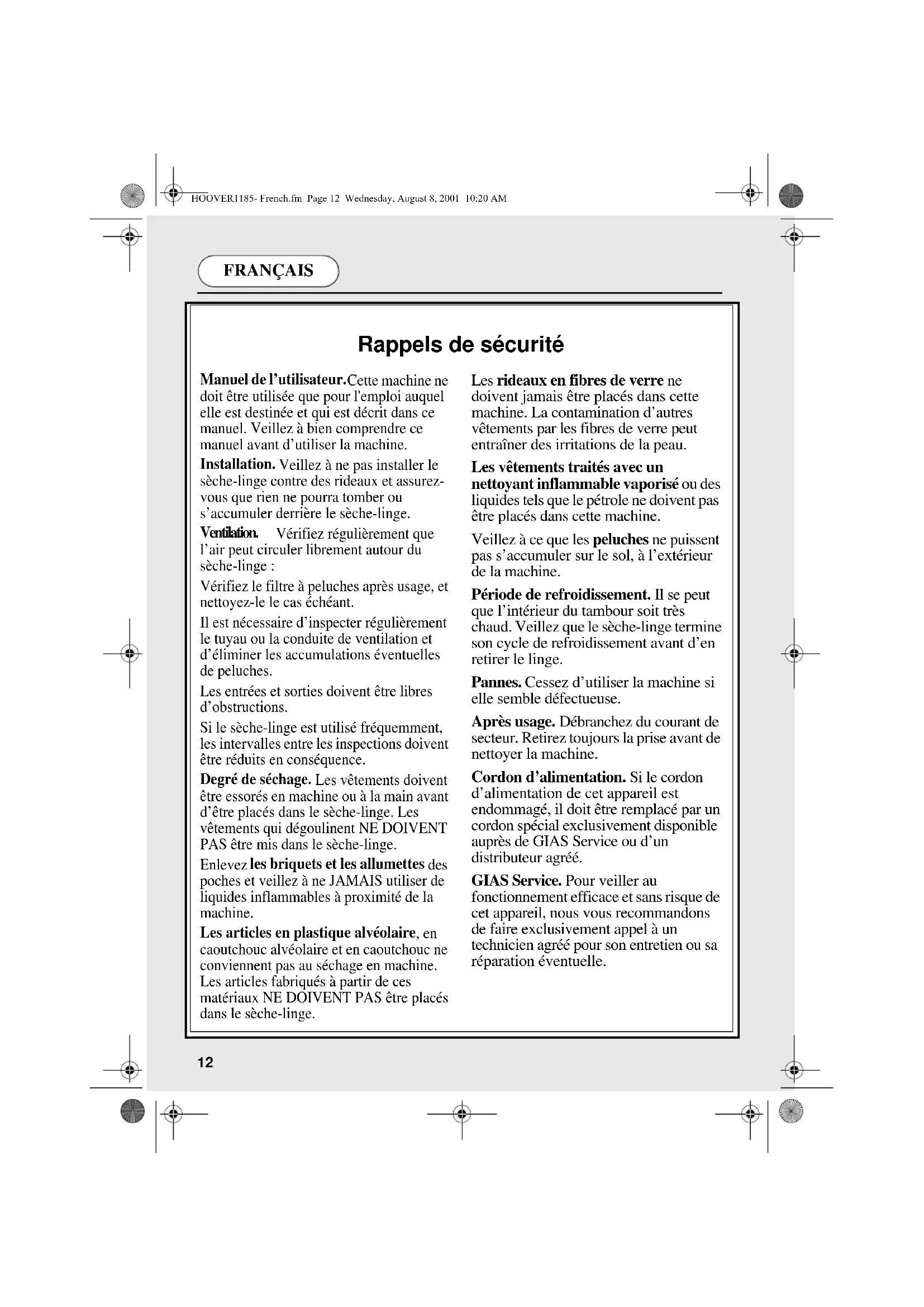 Rappels de sécurité Manuel de l’utilisateur. Cette machine ne doit être utilisée que pour l'emploi auquel elle est destinée et qui est décrit dans ce manuel. Veillez à bien comprendre ce manuel avant d’utiliser la machine. Installation. Veillez à ne pas installer le sèche-linge contre des rideaux et assurez- vous que rien ne pourra tomber ou s’accumuler derrière le sèche-linge. Ventilation. Vérifiez régulièrement que l’air peut circuler librement autour du sèche-linge : Vérifiez le filtre à peluches après usage, et nettoyez-le le cas échéant. Il est nécessaire d’inspecter régulièrement le tuyau ou la conduite de ventilation et d’éliminer les accumulations éventuelles de peluches. Les entrées et sorties doivent être libres d’obstructions. Si le sèche-linge est utilisé fréquemment, les intervalles entre les inspections doivent être réduits en conséquence. Degré de séchage. Les vêtements doivent être essorés en machine ou à la main avant d’être placés dans le sèche-linge. Les vêtements qui dégoulinent NE DOIVENT PAS être mis dans le sèche-linge. Enlevez les briquets et les allumettes des poches et veillez à ne JAMAIS utiliser de liquides inflammables à proximité de la machine. Les articles en plastique alvéolaire , en caoutchouc alvéolaire et en caoutchouc ne conviennent pas au séchage en machine. Les articles fabriqués à partir de ces matériaux NE DOIVENT PAS être placés dans le sèche-linge. Les rideaux en fibres de verre ne doivent jamais être placés dans cette machine. La contamination d’autres vêtements par les fibres de verre peut entraîner des irritations de la peau. Les vêtements traités avec un nettoyant inflammable vaporisé ou des liquides tels que le pétrole ne doivent pas être placés dans cette machine. Veillez à ce que les peluches ne puissent pas s’accumuler sur le sol, à l’extérieur de la machine. Période de refroidissement. Il se peut que l’intérieur du tambour soit très chaud. Veillez que le sèche-linge termine son cycle de refroidissement avant d’en retirer le linge. Pannes. Cessez d’utiliser la machine si elle semble défectueuse. Après usage. Débranchez du courant de secteur. Retirez toujours la prise avant de nettoyer la machine. Cordon d’alimentation. Si le cordon d’alimentation de cet appareil est endommagé, il doit être remplacé par un cordon spécial exclusivement disponible auprès de GIAS Service ou d’un distributeur agréé. GIAS Service. Pour veiller au fonctionnement efficace et sans risque de cet appareil, nous vous recommandons de faire exclusivement appel à un technicien agréé pour son entretien ou sa réparation éventuelle. HOOVER1185- French.fm Page 12 Wednesday, August 8, 2001 10:20 AMFRANÇAIS