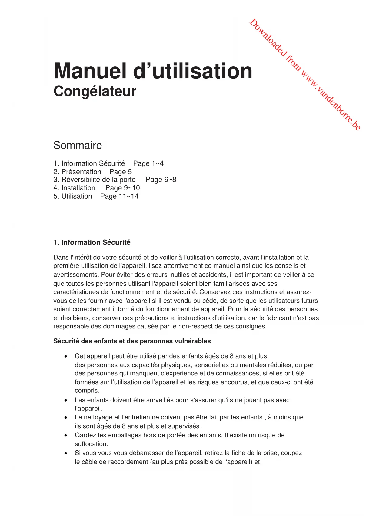 Dans l'intérêt de votre sécurité et de veiller à l'utilisation correcte, avant l’installation et la première utilisation de l'appareil, lisez attentivement ce manuel ainsi que les conseils et avertissements. Pour éviter des erreurs inutiles et accidents, il est important de veiller à ce que toutes les personnes utilisant l'appareil soient bien familiarisées avec ses caractéristiques de fonctionnement et de sécurité. Conservez ces instructions et assurez-vous de les fournir avec l'appareil si il est vendu ou cédé, de sorte que les utilisateurs futurs soient correctement informé du fonctionnement de appareil. Pour la sécurité des personnes et des biens, conserver ces précautions et instructions d’utilisation, car le fabricant n'est pas responsable des dommages causée par le non-respect de ces consignes. Sécurité des enfants et des personnes vulnérables Cet appareil peut être utilisé par des enfants âgés de 8 ans et plus, des personnes aux capacités physiques, sensorielles ou mentales réduites, ou par des personnes qui manquent d'expérience et de connaissances, si elles ont été formées sur l’utilisation de l’appareil et les risques encourus, et que ceux-ci ont été compris. Les enfants doivent être surveillés pour s'assurer qu'ils ne jouent pas avec l'appareil. Le nettoyage et l’entretien ne doivent pas être fait par les enfants , à moins que ils sont âgés de 8 ans et plus et supervisés . Gardez les emballages hors de portée des enfants. Il existe un risque de suffocation. Si vous vous vous débarrasser de l’appareil, retirez la fiche de la prise, coupez le câble de raccordement (au plus près possible de l'appareil) et Downloaded from www.vandenborre.beenlever la porte pour éviter que les enfants subissent un choc électrique ou qu’ils s’enferment à l’interieur. Si cet appareil, muni de fermeture magnétique devait remplacer un ancien appareil ayant un système de verrou sur la porte ou le couvercle, assurez-vous de le rendre inutilisable au moment de vous en débarrasser. Cela permettra d'éviter à l’appareil de devenir un piège mortel pour un enfant.