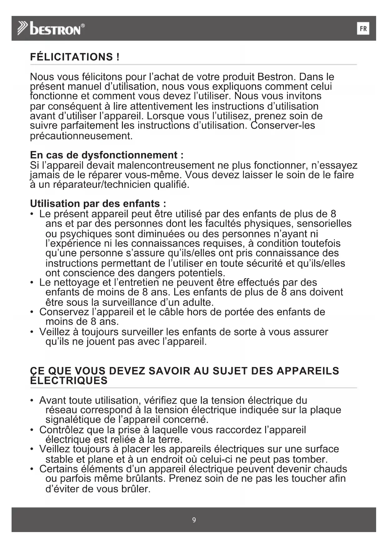 DEFÉLICITATIONS ! Nous vous félicitons pour l’achat de votre produit Bestron. Dans le présent manuel d’utilisation, nous vous expliquons comment celui fonctionne et comment vous devez l’utiliser. Nous vous invitons par conséquent à lire attentivement les instructions d’utilisation avant d’utiliser l’appareil. Lorsque vous l’utilisez, prenez soin de suivre parfaitement les instructions d’utilisation. Conserver-les précautionneusement. En cas de dysfonctionnement : Si l’appareil devait malencontreusement ne plus fonctionner, n’essayez jamais de le réparer vous-même. Vous devez laisser le soin de le faire à un réparateur/technicien qualifié. Utilisation par des enfants :