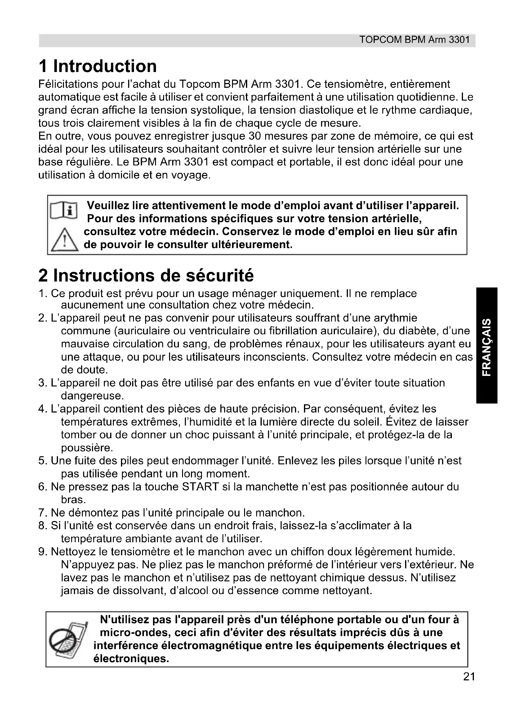 N’appuyez pas. Ne pliez pas le manchon préformé de l’intérieur vers l’extérieur. Ne lavez pas le manchon et n’utilisez pas de nettoyant chimique dessus. N’utilisez jamais de dissolvant, d’alcool ou d’essence comme nettoyant. Veuillez lire attentivement le mode d’emploi avant d’utiliser l’appareil. Pour des informations spécifiques sur votre tension artérielle, consultez votre médecin. Conservez le mode d’emploi en lieu sûr afin de pouvoir le consulter ultérieurement. N'utilisez pas l'appareil près d'un téléphone portable ou d'un four à micro-ondes, ceci afin d'éviter des résultats imprécis dûs à une interférence électromagnétique entre les équipements électriques et électroniques.22 TOPCOM BPM Arm 3301 3 Conseils utiles Voici quelques conseils utiles pour vous aider à obtenir des mesures plus précises :