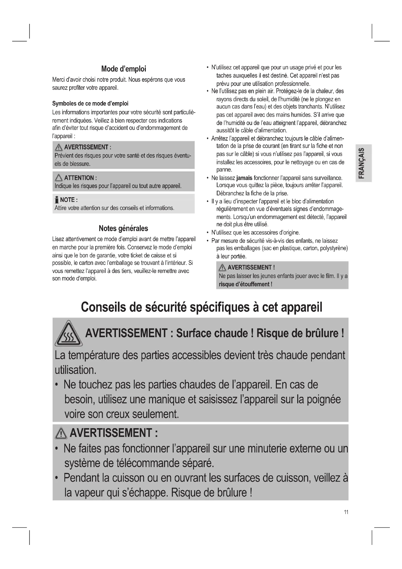 - Par mesure de sécurité vis-à-vis des enfants, ne laissez pas les emballages (sac en plastique, carton, polystyrène) à leur portée. AVERTISSEMENT ! Ne pas laisser les jeunes enfants jouer avec le lm. Il y a risque d’étouffement ! Conseils de sécurité spécifiques à cet appareil