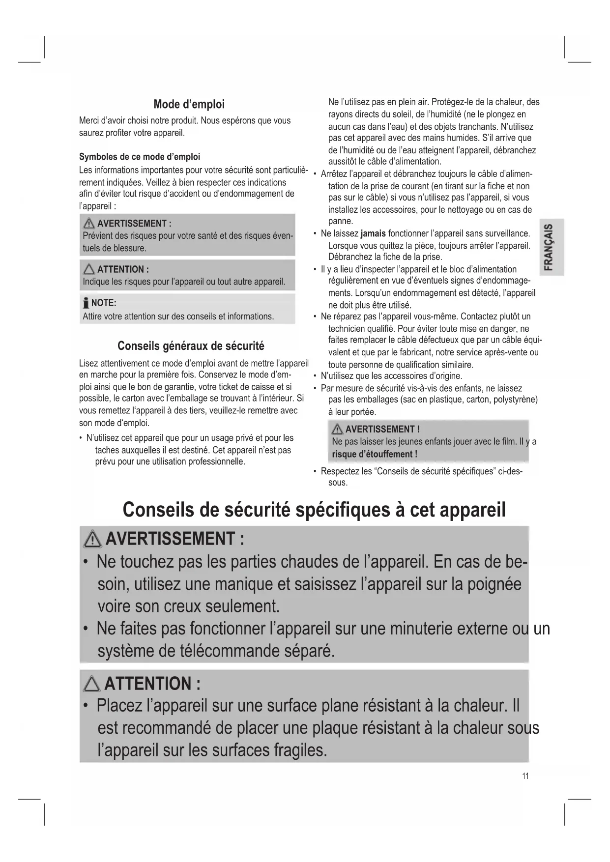 - Respectez les “Conseils de sécurité spéciques” ci-des- sous. Conseils de sécurité spécifiques à cet appareil