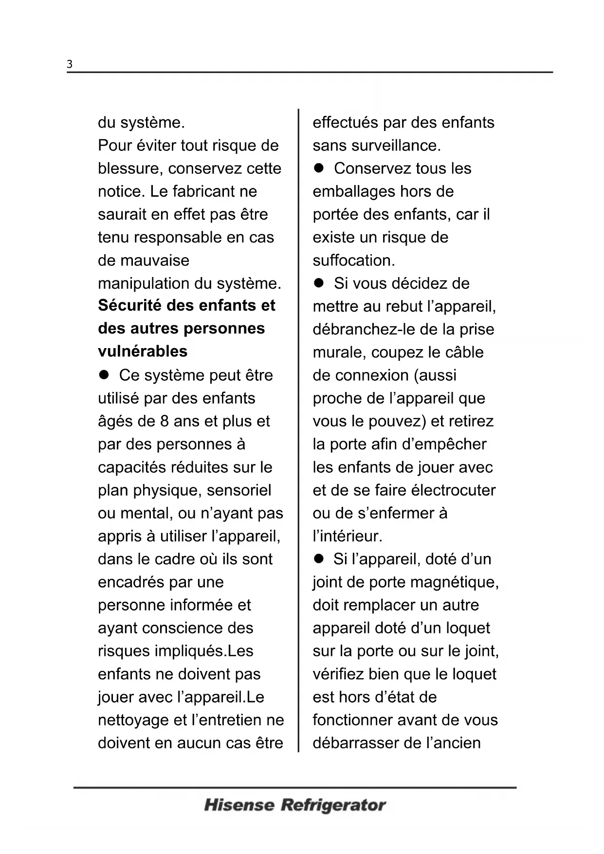du système. Pour éviter tout risque de blessure, conservez cette notice. Le fabricant ne saurait en effet pas être tenu responsable en cas de mauvaise manipulation du système. Sécurité des enfants et des autres personnes vulnérables z Ce système peut être utilisé par des enfants âgés de 8 ans et plus et par des personnes à capacités réduites sur le plan physique, sensoriel ou mental, ou n’ayant pas appris à utiliser l’appareil, dans le cadre où ils sont encadrés par une personne informée et ayant conscience des risques impliqués.Les enfants ne doivent pas jouer avec l’appareil.Le nettoyage et l’entretien ne doivent en aucun cas être effectués par des enfants sans surveillance. z Conservez tous les emballages hors de portée des enfants, car il existe un risque de suffocation. z Si vous décidez de mettre au rebut l’appareil, débranchez-le de la prise murale, coupez le câble de connexion (aussi proche de l’appareil que vous le pouvez) et retirez la porte afin d’empêcher les enfants de jouer avec et de se faire électrocuter ou de s’enfermer à l’intérieur. z Si l’appareil, doté d’un joint de porte magnétique, doit remplacer un autre appareil doté d’un loquet sur la porte ou sur le joint, vérifiez bien que le loquet est hors d’état de fonctionner avant de vous débarrasser de l’ancien