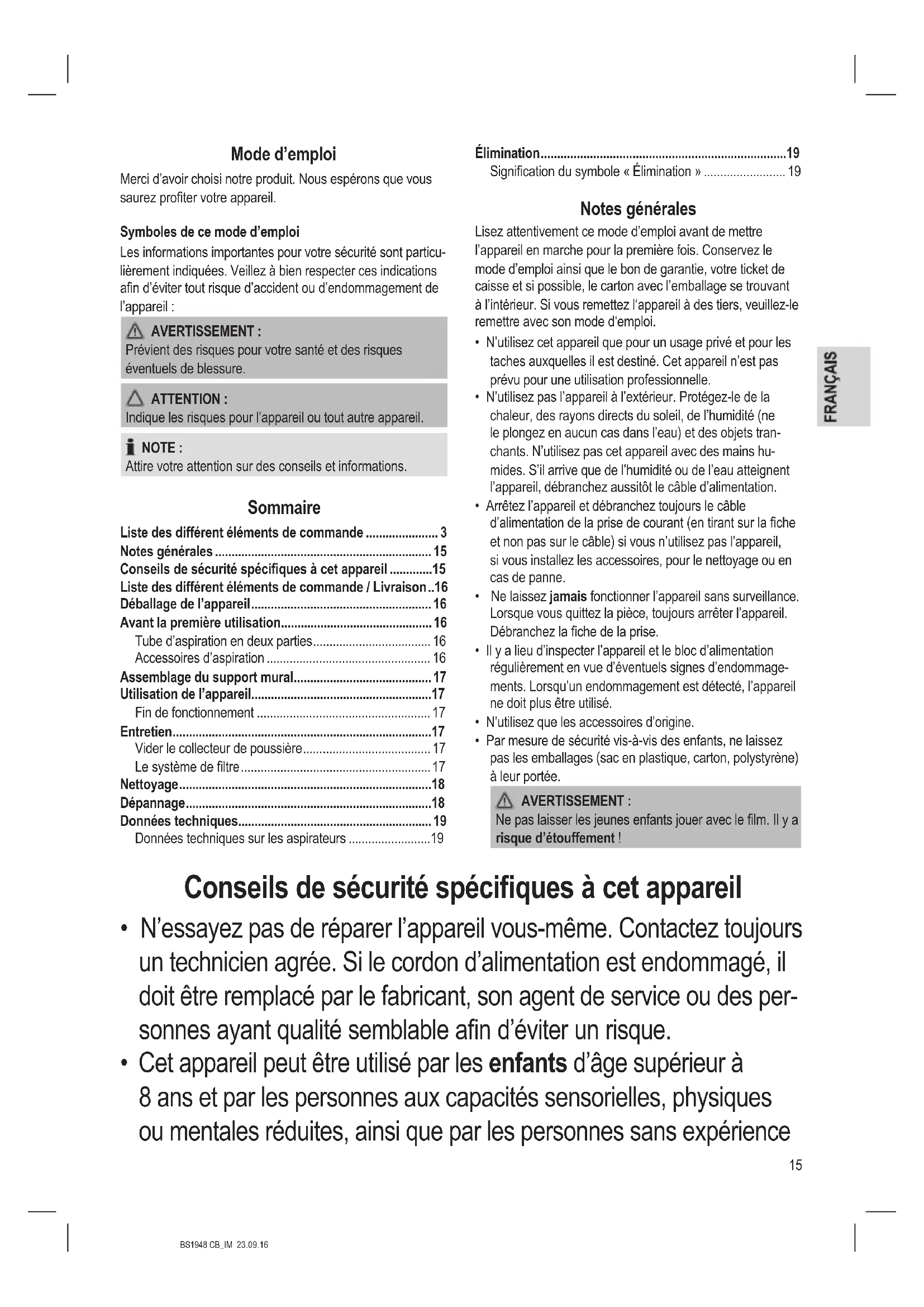 - Cet appareil peut être utilisé par les enfants d’âge supérieur à 8 ans et par les personnes aux capacités sensorielles, physiques ou mentales réduites, ainsi que par les personnes sans expérience16 BS1948 CB_IM 23.09.16 ou connaissances, tant qu’elles sont supervisées et instruites à l’uti- lisation de l’appareil en sécurité et tant qu’elles en comprennent les risques.