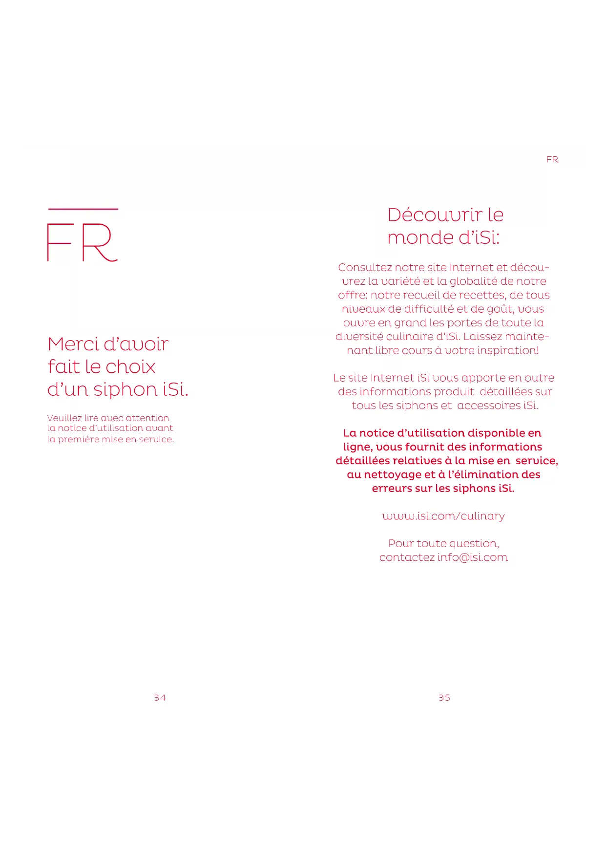 Découvrir le monde d’iSi: Consultez notre site Internet et décou- vrez la variété et la globalité de notre offre: notre recueil de recettes, de tous niveaux de difficulté et de goût, vous ouvre en grand les portes de toute la diversité culinaire d’iSi. Laissez mainte- nant libre cours à votre inspiration! Le site Internet iSi vous apporte en outre des informations produit détaillées sur tous les siphons et accessoires iSi. La notice d’utilisation disponible en ligne, vous fournit des informations détaillées relatives à la mise en service, au nettoyage et à l’élimination des erreurs sur les siphons iSi. www.isi.com/culinary Pour toute question, contactez info@isi.com