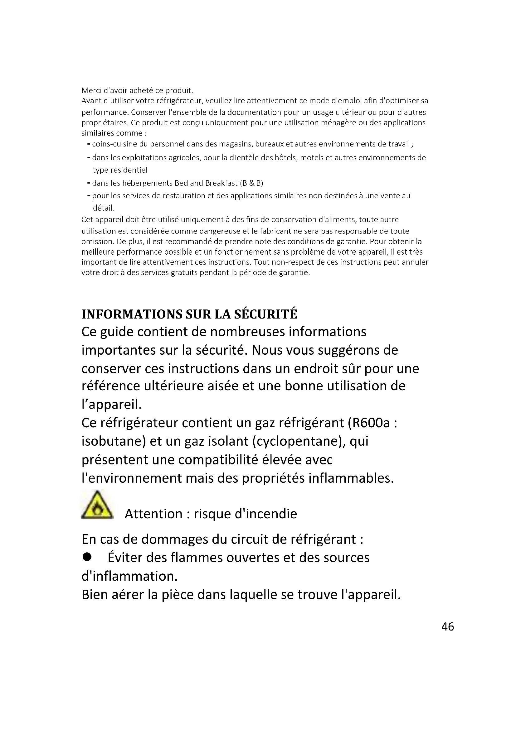 Conformité ...................................................................................................................... 6646 Merci d'avoir acheté ce produit. Avant d'utiliser votre réfrigérateur, veuillez lire attentivement ce mode d'emploi afin d'optimiser sa performance. Conserver l'ensemble de la documentation pour un usage ultérieur ou pour d'autres propriétaires. Ce produit est conçu uniquement pour une utilisation ménagère ou des applications similaires comme : - coins-cuisine du personnel dans des magasins, bureaux et autres environnements de travail ; - dans les exploitations agricoles, pour la clientèle des hôtels, motels et autres environnements de type résidentiel - dans les hébergements Bed and Breakfast (B & B) - pour les services de restauration et des applications similaires non destinées à une vente au détail. Cet appareil doit être utilisé uniquement à des fins de conservation d'aliments, toute autre utilisation est considérée comme dangereuse et le fabricant ne sera pas responsable de toute omission. De plus, il est recommandé de prendre note des conditions de garantie. Pour obtenir la meilleure performance possible et un fonctionnement sans problème de votre appareil, il est très important de lire attentivement ces instructions. Tout non-respect de ces instructions peut annuler votre droit à des services gratuits pendant la période de garantie.