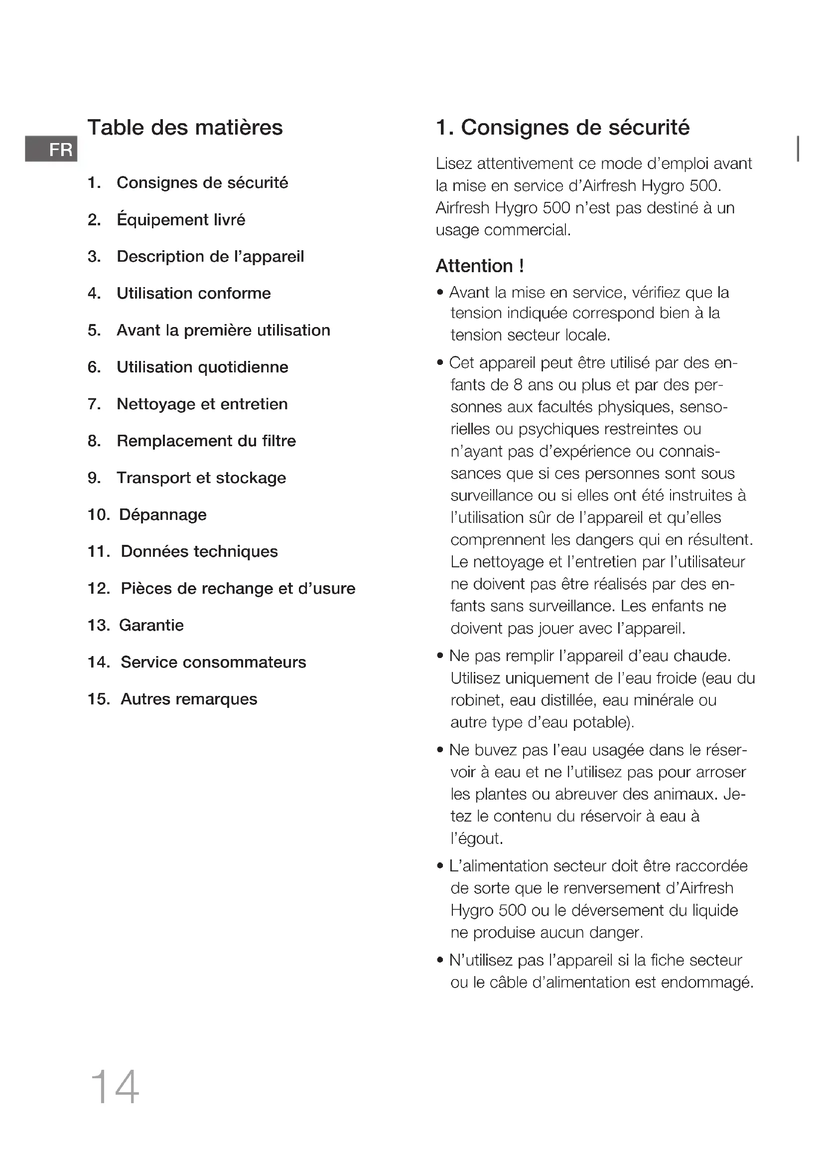 - L’alimentation secteur doit être raccordée de sorte que le renversement d’Airfresh Hygro 500 ou le déversement du liquide ne produise aucun danger.