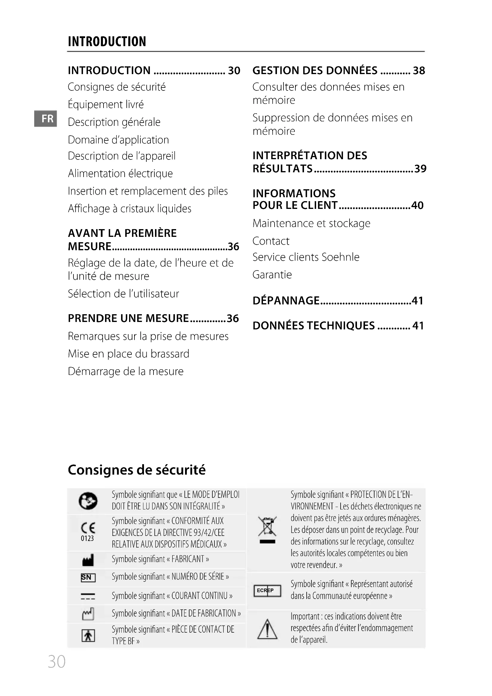 Symbole signifiant « NUMÉRO DE SÉRIE » Symbole signifiant « COURANT CONTINU » Symbole signifiant « DATE DE FABRICATION » Symbole signifiant « PIÈCE DE CONTACT DE TYPE BF » Symbole signifiant « PROTECTION DE L’EN- VIRONNEMENT - Les déchets électroniques ne doivent pas être jetés aux ordures ménagères. Les déposer dans un point de recyclage. Pour des informations sur le recyclage, consultez les autorités locales compétentes ou bien votre revendeur. » EC REP Symbole signifiant « Représentant autorisé dans la Communauté européenne » Important : ces indications doivent être respectées afin d’éviter l’endommagement de l’appareil. Consignes de sécuritéFR