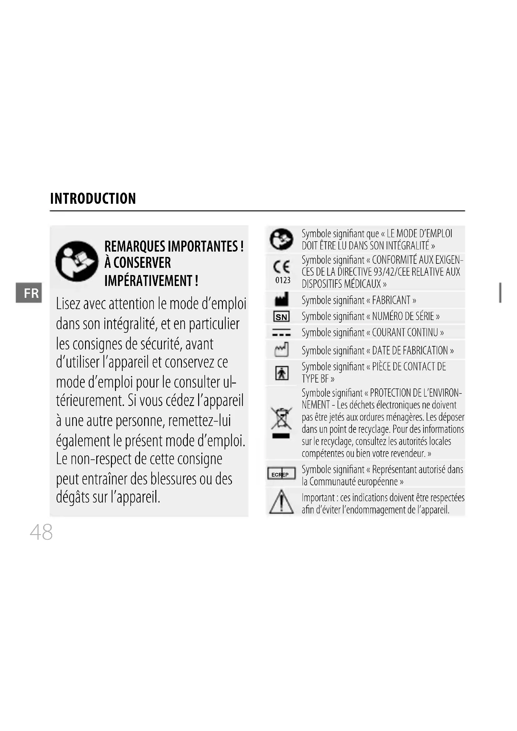 térieurement. Si vous cédez l’appareil à une autre personne, remettez-lui également le présent mode d’emploi. Le non-respect de cette consigne peut entraîner des blessures ou des dégâts sur l’appareil. Symbole signifiant que « LE MODE D’EMPLOI DOIT ÊTRE LU DANS SON INTÉGRALITÉ » Symbole signifiant « CONFORMITÉ AUX EXIGEN- CES DE LA DIRECTIVE 93/42/CEE RELATIVE AUX