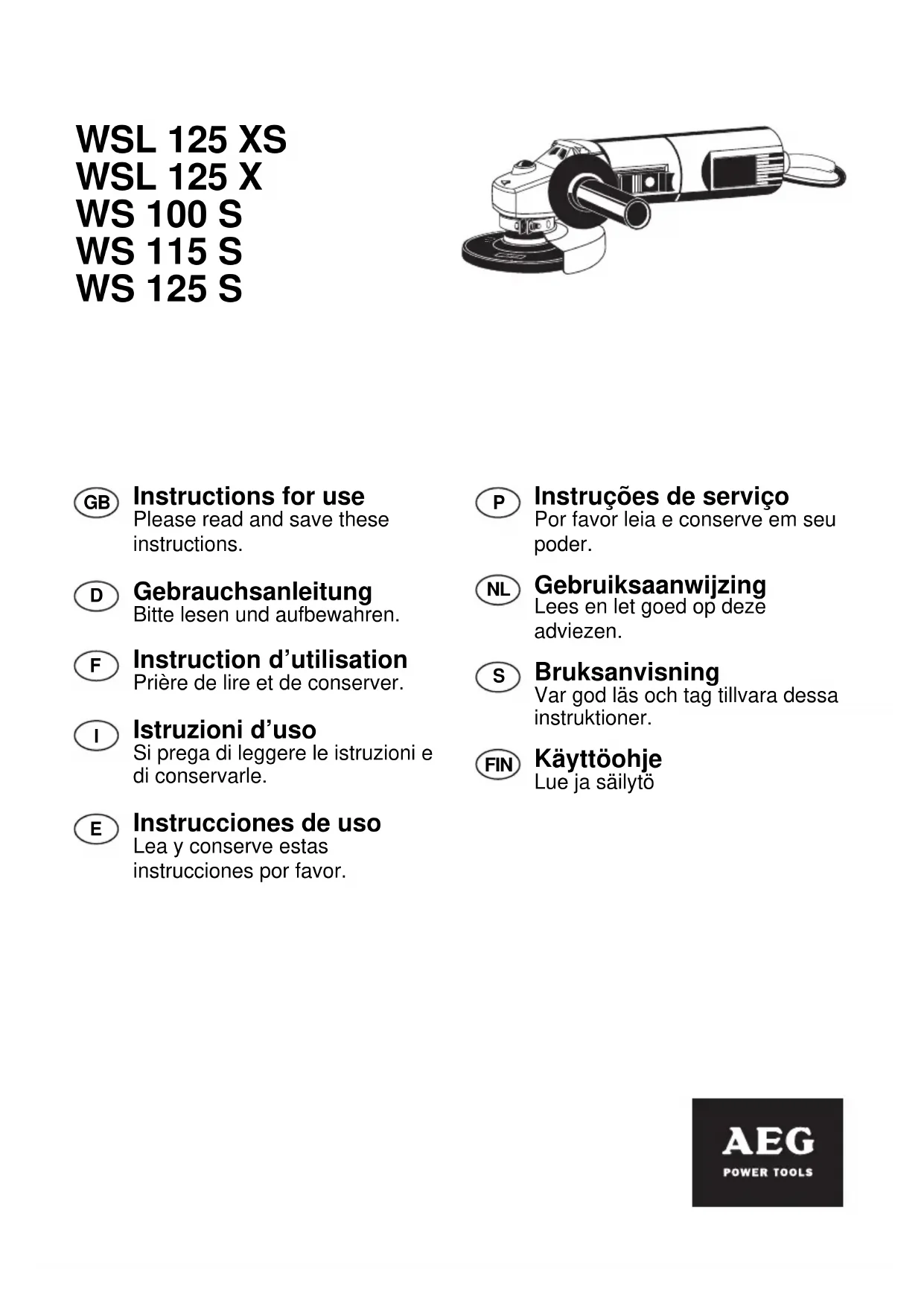 contre la surface du matériau. Une pression trop forte exercée sur la meuleuse pendant les opérations diminue la longévité de la meule et de la machine et donne de mauvais résultats. Ne jamais utiliser de meules de tronçonnage pour dégrossir. Tronçonnage Pour les opérations de tronçonnage, ne pas coincer la meuleuse dans le plan de meulage. La meule doit avoir un tranchant bien profilé et propre. Utiliser obligatoirement le rail de guidage (12) en tronçonnant de la roche. Pour le meulage de surfaces, utiliser le plateau de meulage en plastique avec disque. Pour décaper des vieilles peintures ou de la rouille, utiliser la brosse métallique (9). 7 Accessoires Consulter nos catalogues qui vous renseignent sur notre programme d’accessoires avec leur référence. 8 Entretien Tenir toujours propre les orifices de ventilation de la partie moteur. N’utiliser que des pièces et accessoires AEG. Pour des pièces dont l’échange n’est pas décrit, s’adresser de préférence aux stations de service après-vente AEG (voir brochure Garantie/Adresses des stations de service après-vente). Si besoin est, une vue éclatée de l’appareil peut être fournie. S’adresser, en indiquant bien le numéro à dix chiffres porté sur la plaque signalétique, à votre station de service après–vente (voir liste jointe) ou directement à Atlas Copco Elektrowerkzeuge GmbH, B.P. 320, D–71361 Winnenden. Modifications: Les textes, les illustrations et les données techniques correspondent à la situation au moment de l’impression. Toutes modifications techniques sont réservées dans le cadre du développement technique permanent.I 8WSL 115 XS, WSL 125 X, WS 100 S, WS 115 S, WS 125 S Le i chiede molto ad un prodotto, per questo motivo ha scelto la sicurezza della qualità: la qualità Atlas Copco Abbiamo costruito questo elettroutensile con molta cura, perciò, lo usi in tutta tranquilità; le chiediamo solo di leggere prima queste istruzioni per l’uso, perché è solo in buone mani che un buon elettroutensile puó fare un buon lavoro. Elettroutensile AEG della Atlas Copco 1 Illustrazioni 1 Blocco albero 2 Collare 3 Albero portautensili 4 Vite 5 Calotta di protezione 6 Flangia di bloccaggio 7 Utensile di lavoro 8 Dado di bloccaggio 9 Spazzola in folo d’acciaio (Accessorio*) 10 Interruttore 11 Impugnatura supplementare 12 Platorello (Accessorio*) 13 Carta smeriglio (Accessorio*) 14 Dado di bloccaggio (Accessorio*) 15 Slitta di guida e calotta di protezione per troncare (Accessorio*)