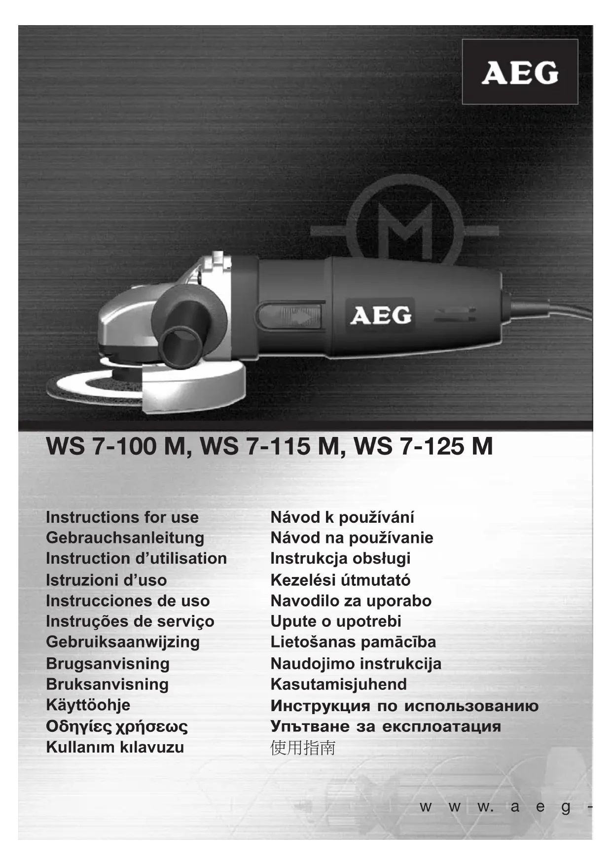 Nous déclarons sous notre responsabilité que ce produit est en conformité avec les normes ou documents normalisés suivants HD 400, EN 50144, EN 55014-1, EN 55014-2, EN 61000-3-2, EN 61000-3-3, conforme aux reglementations 98/37/CE, 89/336/CEE Volker Siegle Manager Product Development BRANCHEMENT SECTEUR Raccorder uniquement à un courant électrique monophasé et uniquement à la tension secteur indiquée sur la plaque signalétique. Le raccordement à des prises de courant sans contact de protection est également possible car la classe de protection II est donnée. ENTRETIEN Tenir toujours propre les orifices de ventilation de la partie moteur. N'utiliser que des pièces et accessoires AEG. Pour des pièces dont l'échange n'est pas décrit, s'adresser de préférence aux stations de service après-vente AEG (voir brochure Garantie/Adresses des stations de service après-vente). Si besoin est, une vue éclatée de l'appareil peut être fournie. S'adresser, en indiquant bien le numéro à dix chiffres porté sur la plaque signalétique, à votre station de service après-vente (voir liste jointe) ou directement à AEG Elektrowerkzeuge, Max-Eyth-Straße 10, D-71364 Winnenden, Germany. SYMBOLES Veuillez lire avec soin le mode d‘emploi avant la mise en service Toujours porter des lunettes protectrices en travaillant avec la machine. Avant tous travaux sur la machine extraire la fiche de la prise de courant. Accessoire - Ces pièces ne font pas partie de la livraison. Il s'agit là de compléments proposés pour votre machine et énumérés dans le catalogue d'accessoires. Valeurs de mesures obtenues conformément à la norme européenne 50 144.15 WS 7-100 M WS 7-115 M WS 7-125 M