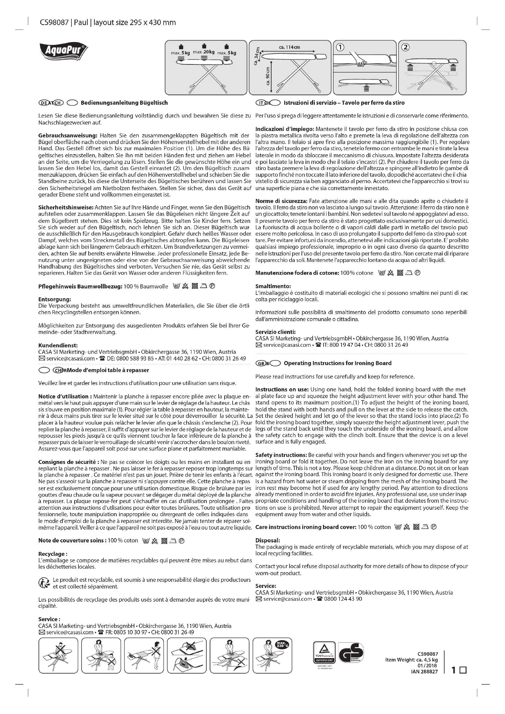 IAN 288827 - Table de repassage AQUAPUR - Notice d'utilisation et mode d'emploi gratuit