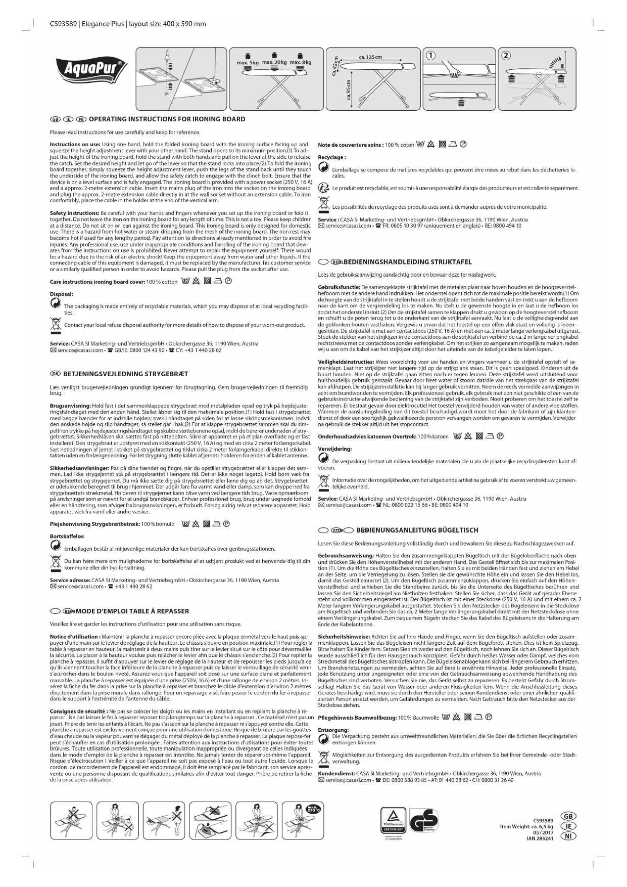 IAN 285241 - Table de repassage AQUAPUR - Notice d'utilisation et mode d'emploi gratuit