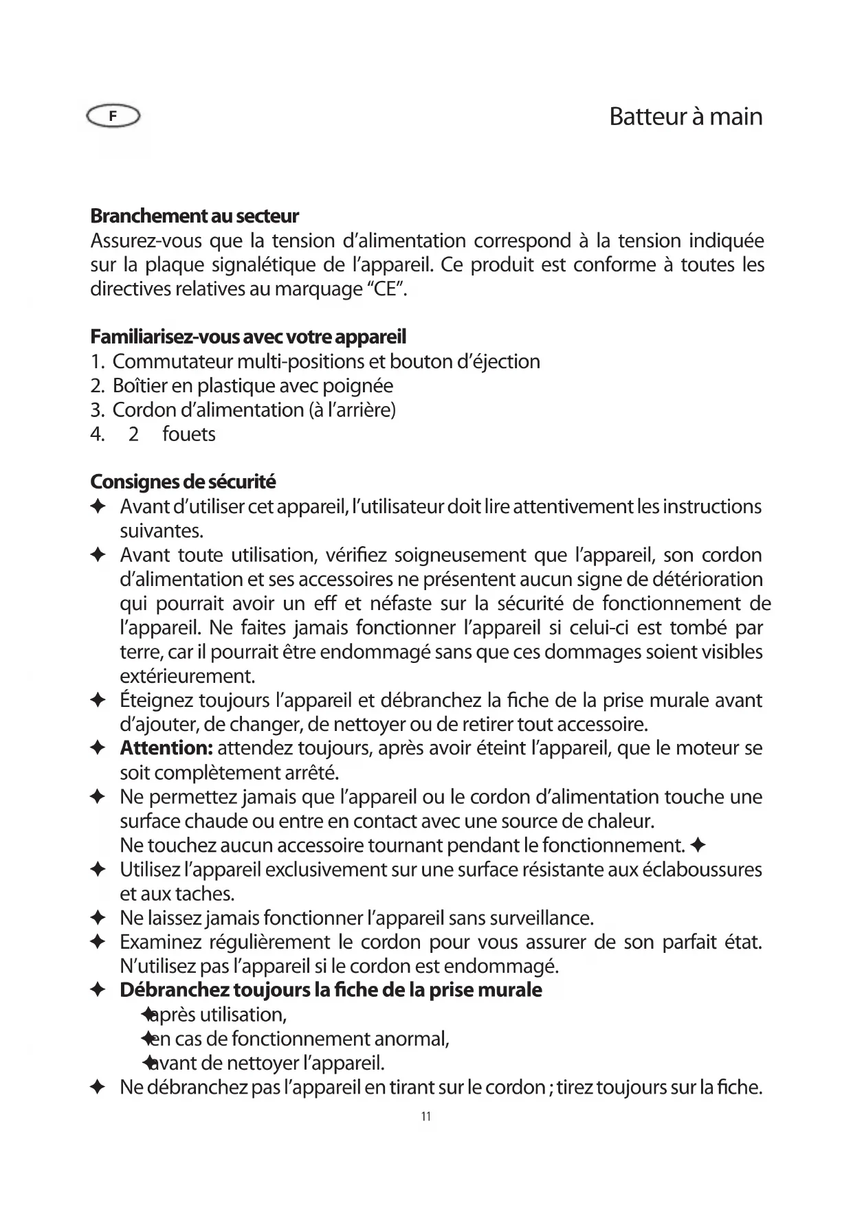 Consignes de sécurité Avant d’utiliser cet appareil, l’utilisateur doit lire attentivement les instructions ✦ suivantes. Avant toute utilisation, véri ez soigneusement que l’appareil, son cordon ✦ d’alimentation et ses accessoires ne présentent aucun signe de détérioration qui pourrait avoir un e et néfaste sur la sécurité de fonctionnement de l’appareil. Ne faites jamais fonctionner l’appareil si celui-ci est tombé par terre, car il pourrait être endommagé sans que ces dommages soient visibles extérieurement. Éteignez toujours l’appareil et débranchez la che de la prise murale avant ✦ d’ajouter, de changer, de nettoyer ou de retirer tout accessoire. Attention: ✦ attendez toujours, après avoir éteint l’appareil, que le moteur se soit complètement arrêté. Ne permettez jamais que l’appareil ou le cordon d’alimentation touche une ✦ surface chaude ou entre en contact avec une source de chaleur. Ne touchez aucun accessoire tournant pendant le fonctionnement. ✦ Utilisez l’appareil exclusivement sur une surface résistante aux éclaboussures ✦ et aux taches. Ne laissez jamais fonctionner l’appareil sans surveillance. ✦ Examinez régulièrement le cordon pour vous assurer de son parfait état. ✦ N’utilisez pas l’appareil si le cordon est endommagé. Débranchez toujours la che de la prise murale ✦ après utilisation, ✦ en cas de fonctionnement anormal, ✦ avant de nettoyer l’appareil. ✦ Ne débranchez pas l’appareil en tirant sur le cordon ; tirez toujours sur la che. ✦