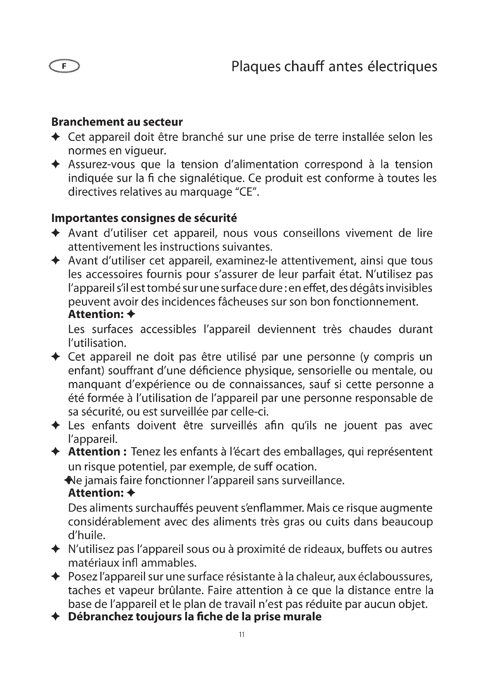 Fen cas de fonctionnement défectueux, ✦ après l’emploi, ✦ avant de nettoyer l’appareil. ✦ Pour retirer le cordon de la prise murale, ne tirez jamais sur le l mais ✦ servez-vous de la che. Ne laissez pas pendre le cordon. ✦ Gardez le câble d’alimentation, et les câbles de tout autre appareil ✦ ménager à l’écart des parties chaudes de la plaque. L’appareil n’est pas destiné à être utilisé avec un programmateur externe ✦ ou une télécommande indépendante. Le fabricant décline toute responsabilité en cas de dégâts dus à une ✦ mauvaise utilisation ou à la non-conformité aux présentes consignes de sécurité. Cet appareil est destiné uniquement à un usage domestique et ne doit ✦ pas servir à un usage professionnel. Utilisez uniquement les accessoires d’origine; l’utilisation d’accessoires ✦ autres que ceux fournis avec ce produit peut poser des risques sérieux à l’utilisateur. Par conformité aux règlements et a n d’éviter tous risques, faire e ectuer ✦ toutes réparations d’appareils électriques, y compris le remplacement du cordon électrique par un personnel quali é. En cas de panne, envoyez l’appareil à l’un de nos services après-vente dont les adresses se trouvent dans l’annexe de ce manuel. Mise en marche Avant d’utiliser l’appareil pour la première fois, faites-le chau er pendant ✦ 3 minutes environ à la puissance maximum (mais sans y poser de récipient ni de casserole) tout en assurant une ventilation su sante. Ceci permettra de ‚brûler’ le revêtement qui protège la plaque contre la corrosion. Durant ce processus, l’appareil émet une légère odeur et un peu de fumée. Ceci est normal et ne dure qu’un petit moment. Nettoyez ensuite l’appareil de la façon décrite dans la section ✦ Entretien et nettoyage ci-dessous. Fonctionnement Posez toujours la casserole sur la plaque chau ante avant de mettre ✦ l’appareil en marche. Assurez-vous que la casserole est propre et sèche à l’extérieur. N’utilisez ✦ pas de casseroles encrassées. Pour ne pas abîmer la plaque, n’utilisez que des casseroles à fond plat. ✦ Les casseroles conçues spéci quement pour les plaques chau antes 12sont recommandées (voir illustration. I). Assurez-vous que la casserole fait au moins le diamètre de la plaque. Ceci ✦ minimise la perte de chaleur et protège la plaque contre les dommages résultant d’une distribution inégale de la chaleur. Réglage du thermostat 6 : Pré-cuisson et rôtissage rapide ✦ 4-5 : Cuisson régulière, rôtissage ✦ 3-4 : Mijotage ✦ 1-2 : Maintien au chaud ✦ Réglez le thermostat sur ‘z’ après utilisation. Pour assurer que l’appareil est complètement éteint, débranchez la prise murale. Témoin lumineux Le témoin lumineux reste allumé pendant que la plaque chau e. Il s’éteint lorsque la température pré-sélectionnée est atteinte. Entretien et nettoyage Avant de nettoyer l’appareil, débranchez toujours la che de la prise de ✦ courant et laissez l’appareil refroidir su samment. Pour éviter le risque de décharge électrique, ne nettoyez pas l’appareil à ✦ l’eau et ne le plongez pas dans l’eau. N’utilisez pas de produits abrasifs ni de détergents très puissants. ✦ Après utilisation, essuyez les éclaboussures sur la plaque avec un chi on ✦ mouillé. Utilisez un produit nettoyant adapté pour entretenir la plaque de temps ✦ en temps. Mise au rebut Ne jetez pas vos appareils ménagers vétustes ou défectueux avec vos ordures ménagères; apportez-les à un centre de collecte sélective des déchets électriques et électroniques. Garantie Cet appareil est garanti par le fabricant pendant une durée de deux ans à partir de la date d‘achat, contre tous défauts de matière et vices de fabrication. Au cours de cette période, toute pièce défectueuse sera remplacée gratuitement. Cette garantie ne couvre pas l‘usure normale de l‘appareil, les pièces cassables telles que du verre, des ampoules, etc., ni les détériorations provoquées par une mauvaise utilisation et le non-respect du 13mode d‘emploi. Aucune garantie ne sera due si l‘appareil a fait l‘objet d‘une intervention à titre de réparation ou d‘entretien par des personnes non- agréées par nous-mêmes. Cette garantie n‘a ecte pas les droits légaux des consommateurs sous les lois nationales applicables en vigueur, ni les droits du consommateur face au revendeur résultant du contrat de vente/d‘achat. Si votre appareil ne fonctionne plus normalement, veuillez l‘adresser, sous emballage solide, à une de nos stations de service après-vente agréées, muni de votre nom et adresse. Si vous retournez votre appareil pendant la période de garantie, n‘oubliez pas de joindre à votre envoi la preuve de garantie (ticket de caisse, facture etc.) certi ée par le vendeur. 14Elektrische tafel warmhoudplaten Aansluiting Dit apparaat mag alleen worden aangesloten op een volgens de wet ✦ geinstalleerd geaard stopcontact. Zorg ervoor dat de op het typeplaatje aangegeven spanning overeenkomt ✦ met de netspanning. Dit produkt komt overeen met de richtlijnen aangegeven op het CE-label. Belangrijke veiligheids instructies Voordat het apparaat wordt gebruikt moet de gebruiker eerst de ✦ volgende instructies zorgvuldig lezen. Voordat het apparaat wordt gebruikt moet zowel de hoofdeenheid ✦ als gelijk welk hulpstuk, dat wordt aangebracht, eerst zorgvuldig op eventuele defecten worden gecontroleerd. Ingeval het apparaat, bij voorbeeld, op een hard oppervlak is gevallen mag het niet meer worden gebruikt: zelfs onzichtbare beschadiging kan ongewenste e ecten hebben op de gebruiksveiligheid van het apparaat. Attentie ✦ : De te bereiken oppervlakken van het huis worden tijdens het gebruikt erg heet. Dit apparaat is niet bestemd voor gebruik door personen (Kinderen ✦ inbegrepen) met verminderde fysische, zintuiglijke of mentale bekwaamheid, of g