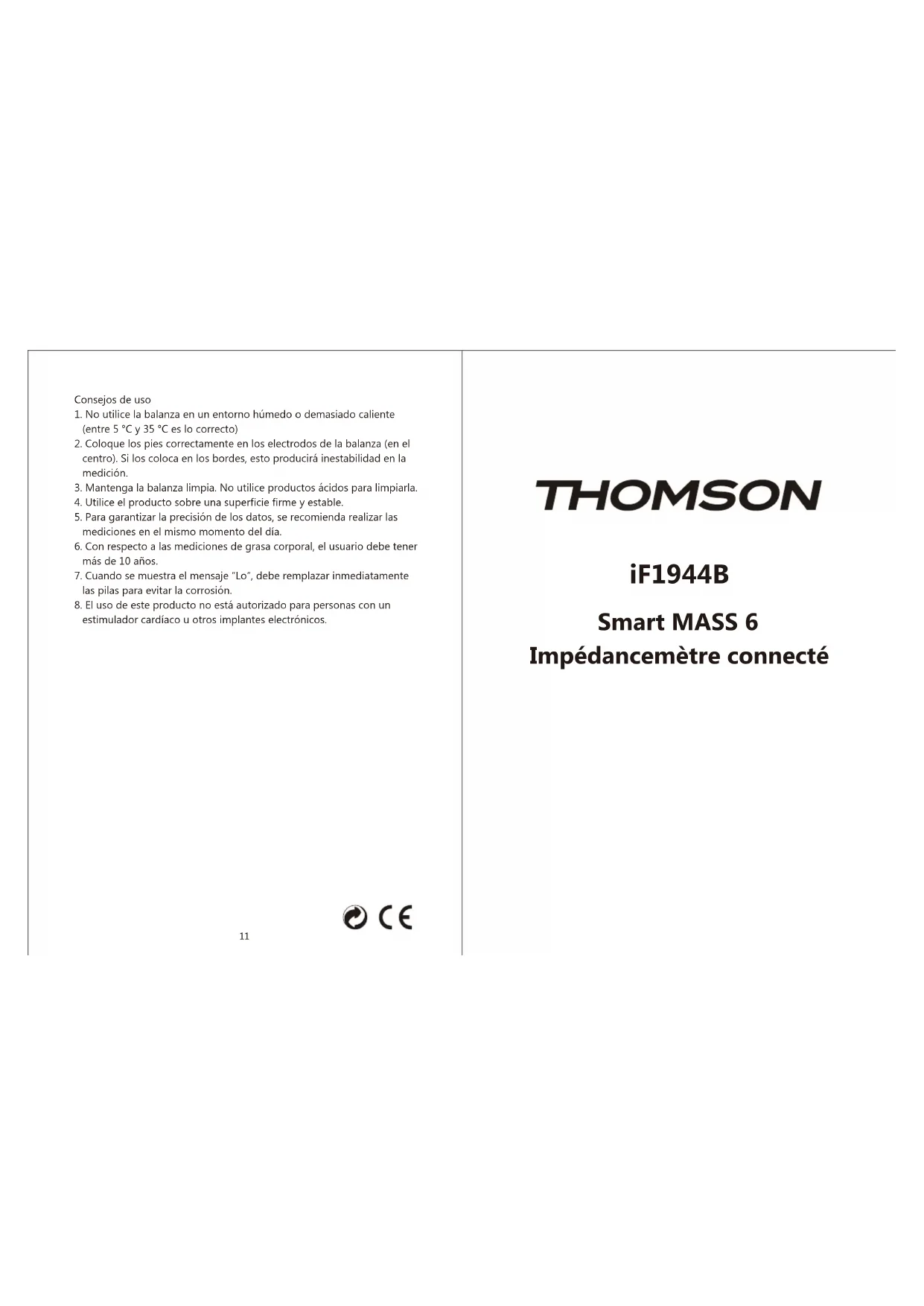 iF1944B Smart MASS 6 Impédancemètre connectéMerci d’avoir acheté l’impédancemètre connecté THOMSON Smart Mass 6. Cet appareil va vous permettre de mesurer toutes vos données de masse corporelle : poids, masse grasse, indice de masse corporelle (IMC), masse osseuse, masse hydrique. Vous pourrez visualiser directement sur l’écran LCD poids et masse grasse, ou transférer par la technologie bluetooth l’ensemble des mesures à une des applications compatibles, après l’avoir connectée à votre pèse-personne. Vous pourrez alors stocker et visualiser sur votre smartphone ou tablette vos différentes données, ainsi que leur évolution au fil du temps. Applications compatibles : Smart Mass 6 est compatible avec plusieurs applications téléchargeables gratuitement sur Play Store ou Apple store, votre choix devant s’effectuer en fonction du type de smartphone ou tablette que vous souhaitez appairer. Si vous utilisez un smartphone ou tablette utilisant iOS (univers Apple) pour la version 11 et au- dessus, ou bien Android pour la version 4.3 et au-des- sus, vous pouvez télécharger gratuitement et utiliser l’application « Smart care – Thomson ». Si vous utilisez un téléphone iOS plus ancien (Version 8 et au-dessus) vous pouvez utiliser l’application « Moving Life ». Pour appairer smartphone/tablette et pèse personne, il vous suffit de suivre les indications qui figurent sur l’application choisie, après avoir activé la fonction bluetooth de votre smartphone/tablette et crée un compte utilisateur. L’appairage ne se fait pas via le menu du téléphone/tablette mais via l’application. Installation des piles (non fournies) Ouvrez le couvercle du support des piles situé derrière l’appareil, comme indiqué sur le dessin ci-dessous, puis installez les piles en phase avec la polarité indiquée à l’intérieur du support piles. Changement de l’unité de mesure du poids kg/st. Vous pouvez changer d’unité de mesure en actionnant le curseur qui se trouve sous le compartiment pile, comme indiqué sur le dessin ci-dessous. Appairer votre téléphone et votre pèse personne. Ouvrez l’application choisie (voir ci-dessus) et actionnez la fonction bluetooth de votre téléphone/tablette. Attention votre pèse personne doit être en état de fonctionnement lorsque vous souhaitez l’appairer à l’application. Lorsque l’appairage est effectif, l’un des symboles ci-dessous doit être affiché sans discontinuer. Lorsque l’appairage a échoué, ce même symbole se met à clignoter. 1 2Commencez la mesure : Pour la première mesure, assurez-vous que le pèse-personne est bien connecté avec l’application choisie, puis positionnez le sur un support solide et plat (type parquet ou carrelage), puis montez pieds nus ou en chaussettes fines sur le plateau pour démarrer la mesure. Lorsque votre poids s’affiche sur l’écran LCD et se met à clignoter, la mesure des autres éléments corporels, comme la masse grasse débute. La mesure des autres éléments corporels est calculée en fonction des renseignements que vous aurez effectués lors de la création de votre compte utilisateur sur l’application (sexe, âge, taille etc…). Si vous n’avez pas renseigné ces informations, vos données corporelles ne pourront pas être mesurées, seul le poids sera mesuré par smart Mass 6. Après l’affichage du poids sur le LCD du pèse personne, vous verrez apparaître votre masse grasse, puis le pèse-personne s’éteindra automatiquement. En cas de port de chaussettes trop épaisses, seul le poids et l’indice de masse corporelle pourront être mesurés. La mesure de la masse grasse est en cours, ne descendez pas du pèse-personne et assurez vous que vos pieds sont bien positionnés sur les électrodes La masse grasse est trop faible, elle ne peut être mesurée. Il vous est conseillé de consulter un médecin. L’indication de la masse grasse est trop élevée. Elle ne peut être mesurée. Il est conseillé de consulter un médecin. Erreur de calibrage au début de la mesure, veuillez faire un nouvel essai. Le nombre d’utilisateurs maximum a été atteint. Les piles de votre pèse-personne sont usagées, veuillez les changer. Les indications d’avertissement
