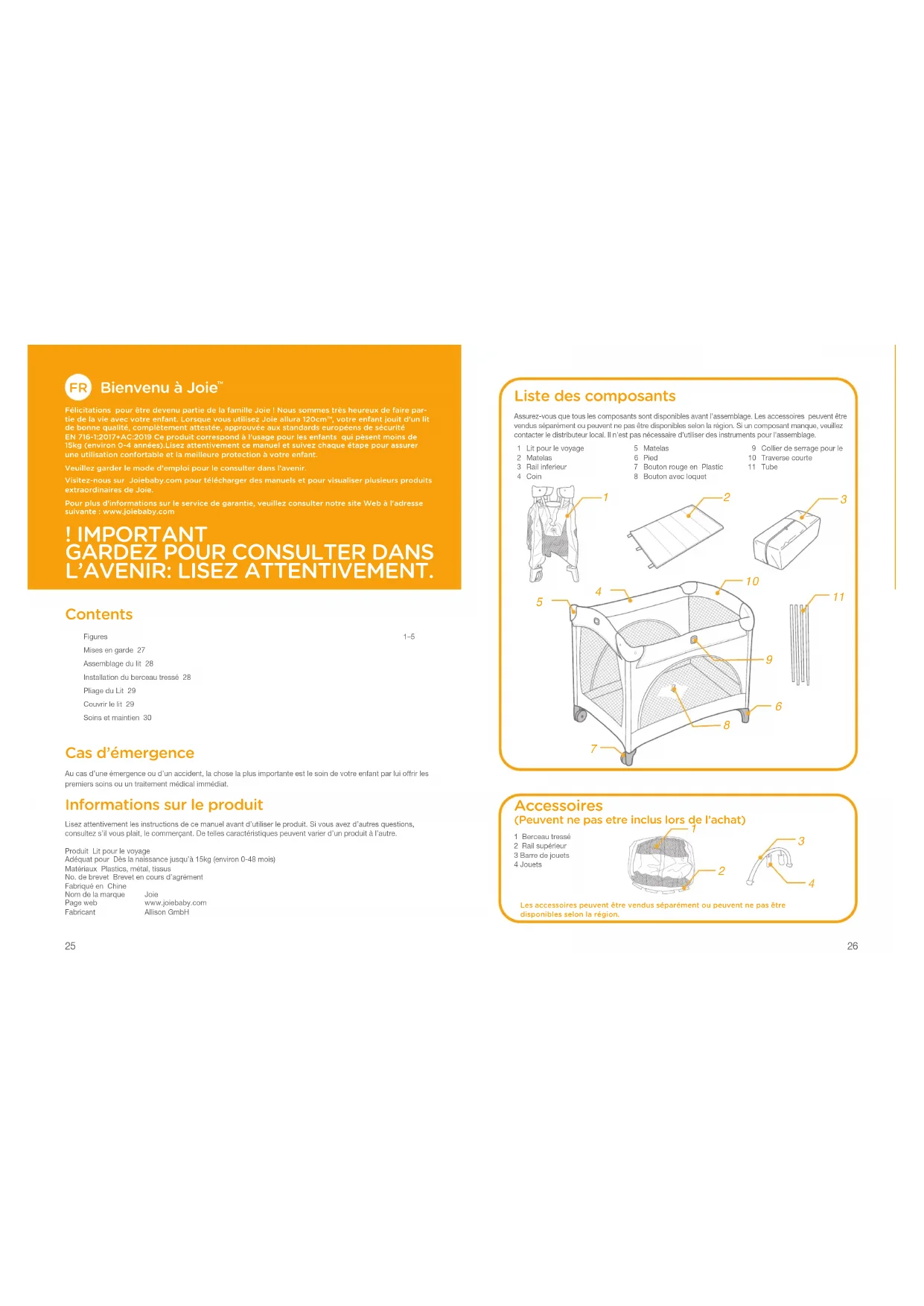 L’AVENIR: LISEZ ATTENTIVEMENT. Contents Figures 1–5Mises en garde 27Assemblage du lit 28Installation du berceau tressé 28Pliage du Lit 29Couvrir le lit 29Soins et maintien 30 Cas d’émergence Au cas d’une émergence ou d’un accident, la chose la plus importante est le soin de votre enfant par lui offrir les premiers soins ou un traitement médical immédiat. Informations sur le produit Lisez attentivement les instructions de ce manuel avant d’utiliser le produit. Si vous avez d’autres questions, consultez s’il vous plait, le commerçant. De telles caractéristiques peuvent varier d’un produit à l’autre.Produit Lit pour le voyageAdéquat pour Dès la naissance jusqu’à 15kg (environ 0-48 mois)Matériaux Plastics, métal, tissusNo. de brevet Brevet en cours d’agrémentFabriqué en ChineNom de la marque JoiePage web www.joiebaby.comFabricant Allison GmbH 1 Lit pour le voyage 2 Matelas 3 Rail inferieur 4 Coin 5 Matelas 6 Pied 7 Bouton rouge en Plastic 8 Bouton avec loquet 9 Collier de serrage pour le 10 Traverse courte11 Tube Liste des composants Assurez-vous que tous les composants sont disponibles avant l'assemblage. Les accessoires peuvent être vendus séparément ou peuvent ne pas être disponibles selon la région. Si un composant manque, veuillez contacter le distributeur local. Il n'est pas nécessaire d'utiliser des instruments pour l'assemblage. Accessoires (Peuvent ne pas etre inclus lors de l’achat) 1 Berceau tressé2 Rail supérieur3 Barre de jouets4 JouetsLes accessoires peuvent être vendus séparément ou peuvent ne pas être disponibles selon la région.