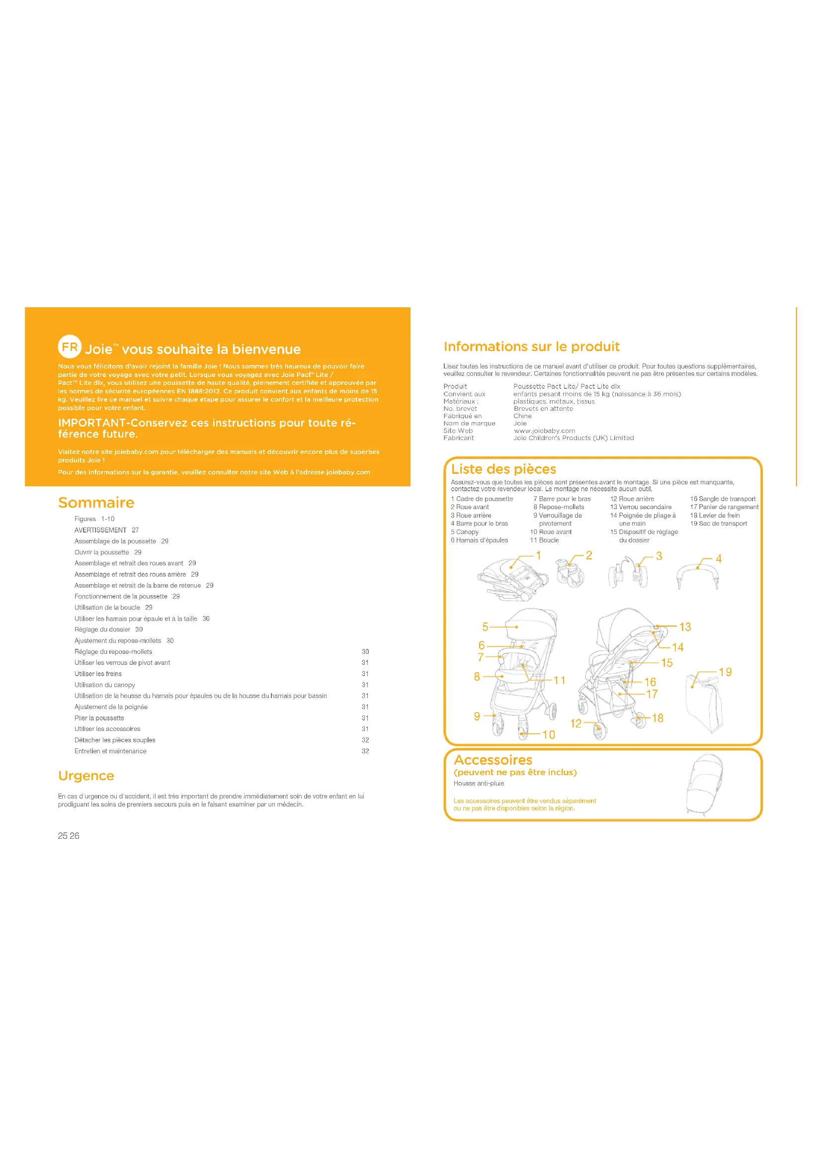 Lite dlx, vous utilisez une poussette de haute qualité, pleinement certifiée et approuvée par les normes de sécurité européennes EN 1888:2012. Ce produit convient aux enfants de moins de 15 kg. Veuillez lire ce manuel et suivre chaque étape pour assurer le confort et la meilleure protection possible pour votre enfant. IMPORTANT-Conservez ces instructions pour toute ré- férence future. Visitez notre site joiebaby.com pour télécharger des manuels et découvrir encore plus de superbes produits Joie !Pour des informations sur la garantie, veuillez consulter notre site Web à l’adresse joiebaby.com Sommaire Figures 1-10AVERTISSEMENT 27Assemblage de la poussette 29Ouvrir la poussette 29Assemblage et retrait des roues avant 29Assemblage et retrait des roues arrière 29Assemblage et retrait de la barre de retenue 29Fonctionnement de la poussette 29Utilisation de la boucle 29Utiliser les harnais pour épaule et à la taille 30Réglage du dossier 30Ajustement du repose-mollets 30Réglage du repose-mollets 30Utiliser les verrous de pivot avant 31Utiliser les freins 31Utilisation du canopy 31Utilisation de la housse du harnais pour épaules ou de la housse du harnais pour bassin 31Ajustement de la poignée 31Plier la poussette 31Utiliser les accessoires 31Détacher les pièces souples 32Entretien et maintenance 32 Urgence En cas d'urgence ou d'accident, il est très important de prendre immédiatement soin de votre enfant en lui prodiguant les soins de premiers secours puis en le faisant examiner par un médecin. Informations sur le produit Lisez toutes les instructions de ce manuel avant d'utiliser ce produit. Pour toutes questions supplémentaires, veuillez consulter le revendeur. Certaines fonctionnalités peuvent ne pas être présentes sur certains modèles.Produit Poussette Pact Lite/ Pact Lite dlxConvient aux enfants pesant moins de 15 kg (naissance à 36 mois)Matériaux : plastiques, métaux, tissusNo. brevet Brevets en attenteFabriqué en ChineNom de marque JoieSite Web www.joiebaby.comFabricant Joie Children's Products (UK) Limited1 Cadre de poussette2 Roue avant3 Roue arrière4 Barre pour le bras5 Canopy6 Harnais d'épaules 7 Barre pour le bras 8 Repose-mollets 9 Verrouillage de pivotement10 Roue avant11 Boucle12 Roue arrière13 Verrou secondaire14 Poignée de pliage à une main15 Dispositif de réglage du dossier16 Sangle de transport17 Panier de rangement18 Levier de frein19 Sac de transport Liste des pièces Assurez-vous que toutes les pièces sont présentes avant le montage. Si une pièce est manquante, contactez votre revendeur local. Le montage ne nécessite aucun outil. Accessoires (peuvent ne pas être inclus)Housse anti-pluieLes accessoires peuvent être vendus séparément ou ne pas être disponibles selon la région.