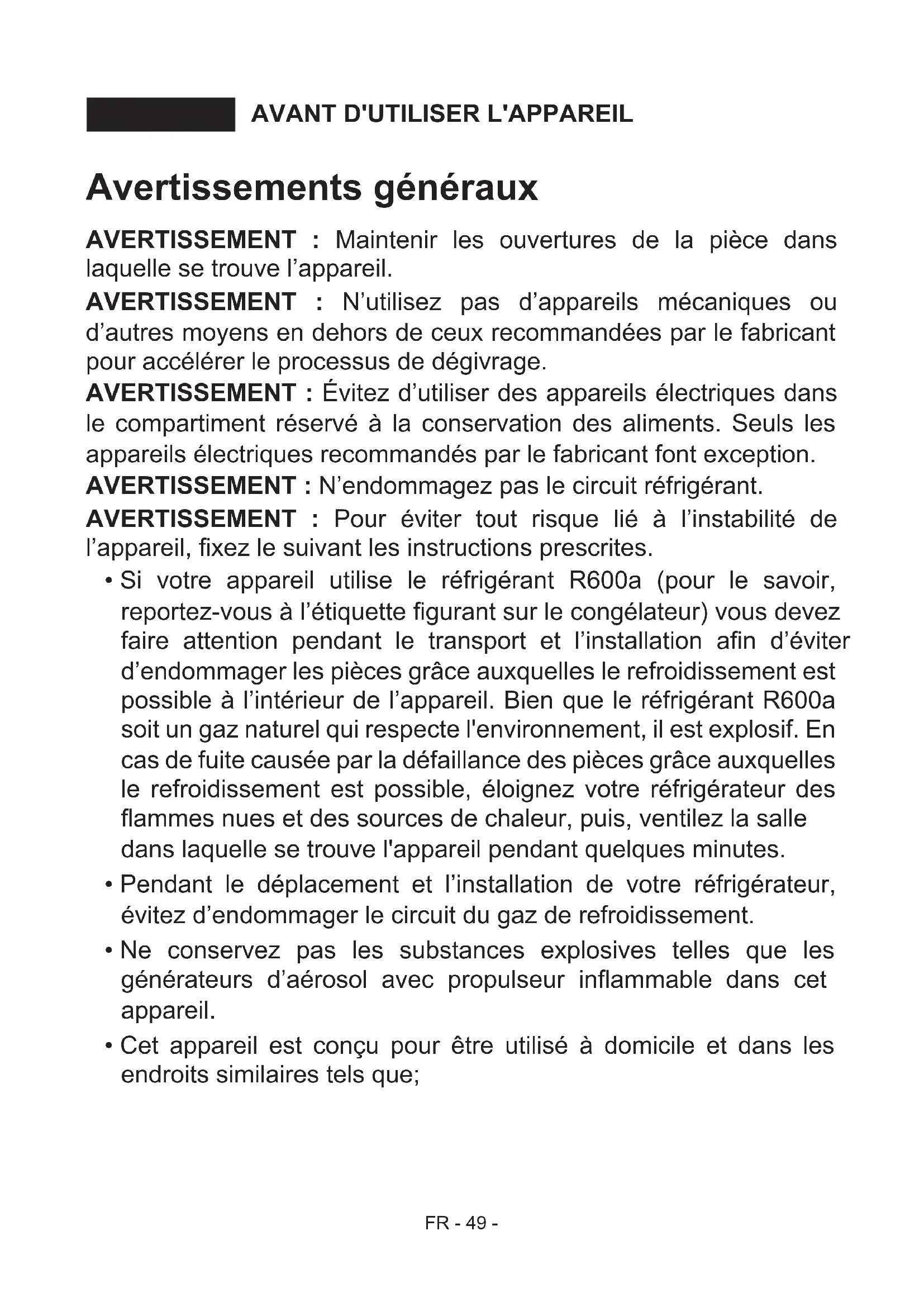 AVERTISSEMENT : N'utilisez pas d'appareils mécaniques ou autres moyens en dehors de ceux recommandées par le fabricant pour accélérer le processus de dégivrage.
