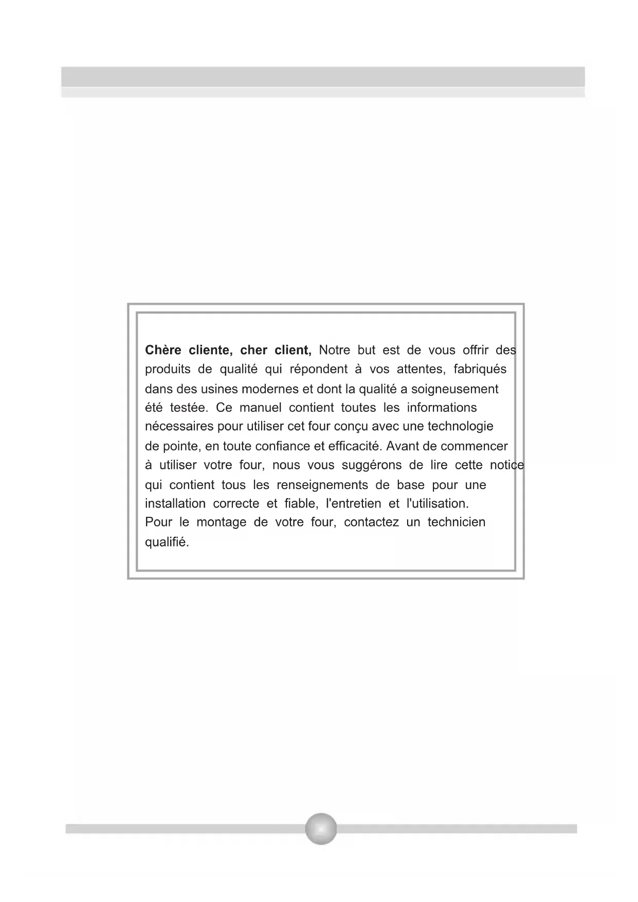 Chere cliente, cher client, Notre but est de vous offrir des produits de qualite qui repondent a vos attentes, fabriqués dans des usines modernes et dont la qualite a soigneusement ete testee. Ce manuel contient toutes les informations necessaires pour utiliser cet four conqu avec une technologie de pointe, en toute confiance et efficacite. Avant de commencer à utiliser votre four, nous vous suggerons de dire cette notice qui contient tous les renseignements de base pour une installation correcte et fiable, l'entretien et l'utilisation. Pour le montage de votre four, contactez un technician qualifie.