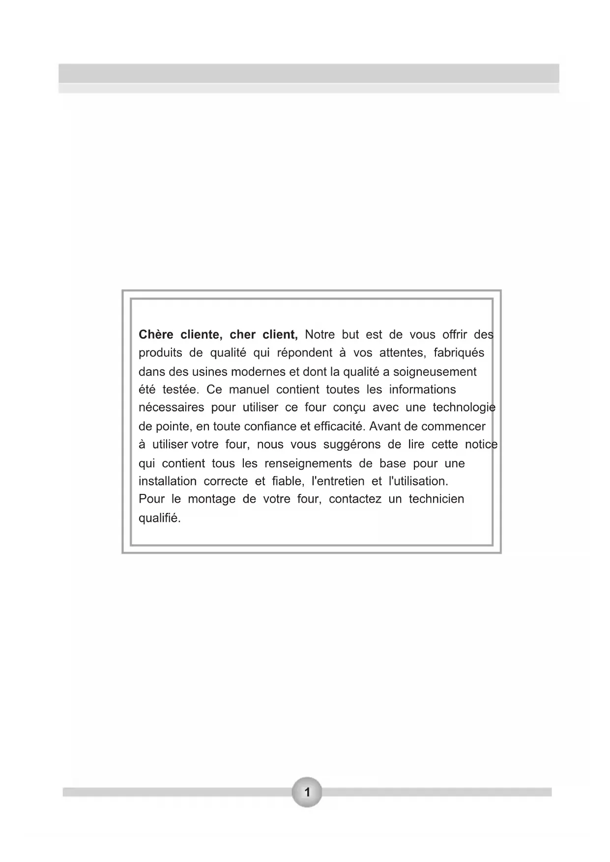 Chere cliente, cher client, Notre but est de vous offrir des produits de qualite qui repondent a vos attentes, fabriqués dans des usines modernes et dont la qualite a soigneusement ete testee. Ce manuel contient toutes les informations necessaires pour utiliser ce four conu avec une technologie de pointe, en toute confiance et efficacite. Avant de commencer à utiliser votre four, nous vous suggerons de dire cette notice qui contient tous les renseignements de base pour une installation correcte et fiable, l'entretien et l'utilisation. Pour le montage de votre four, contactez un technician qualifie.