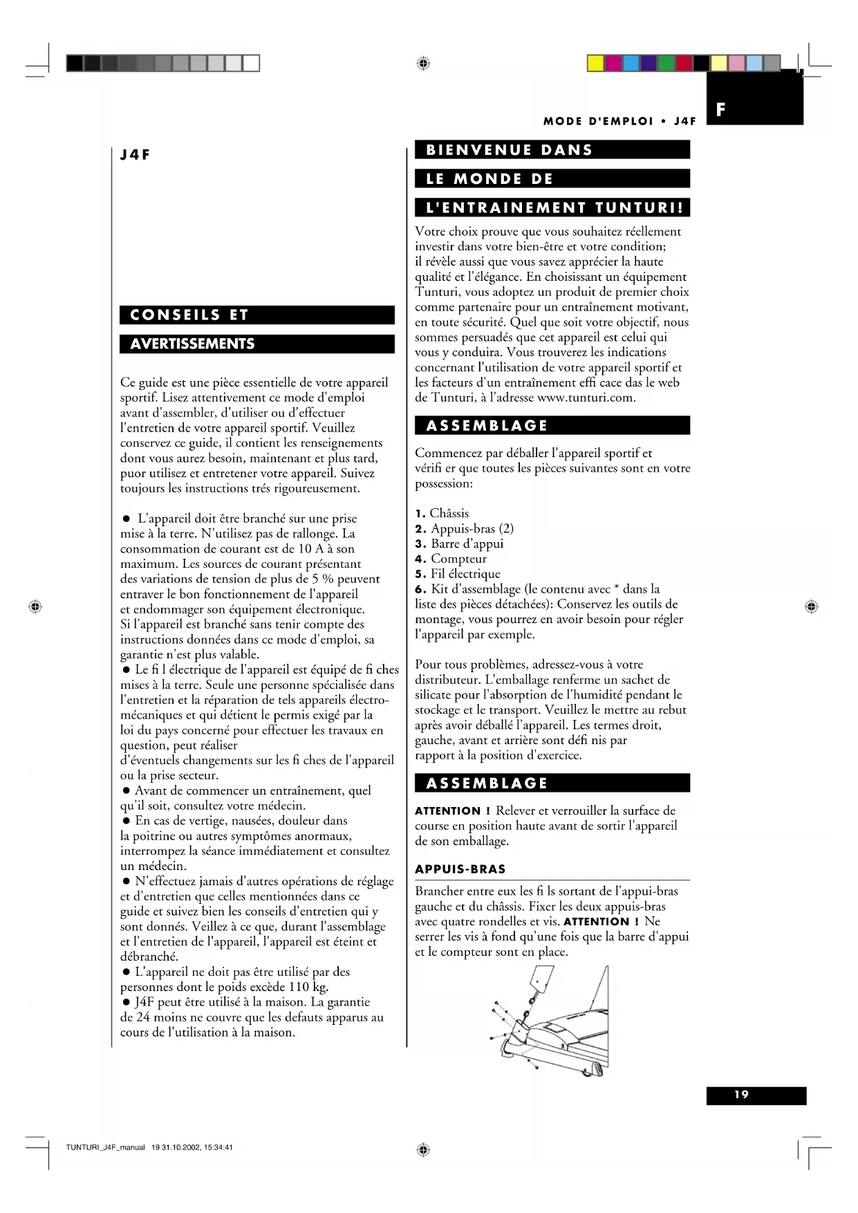 liste des pièces détachées): Conservez les outils de montage, vous pourrez en avoir besoin pour régler l'appareil par exemple. Pour tous problèmes, adressez-vous à votre distributeur. L'emballage renferme un sachet de silicate pour l'absorption de l'humidité pendant le stockage et le transport. Veuillez le mettre au rebut après avoir déballé l'appareil. Les termes droit, gauche, avant et arrière sont défi nis par rapport à la position d'exercice. ASSEMBLAGE ATTENTION ! Relever et verrouiller la surface de course en position haute avant de sortir l'appareil de son emballage. APPUIS-BRAS Brancher entre eux les fi ls sortant de l'appui-bras gauche et du châssis. Fixer les deux appuis-bras avec quatre rondelles et vis. ATTENTION ! Ne serrer les vis à fond qu'une fois que la barre d'appui et le compteur sont en place. TUNTURI_J4F_manual 19 31.10.2002, 15:34:4120