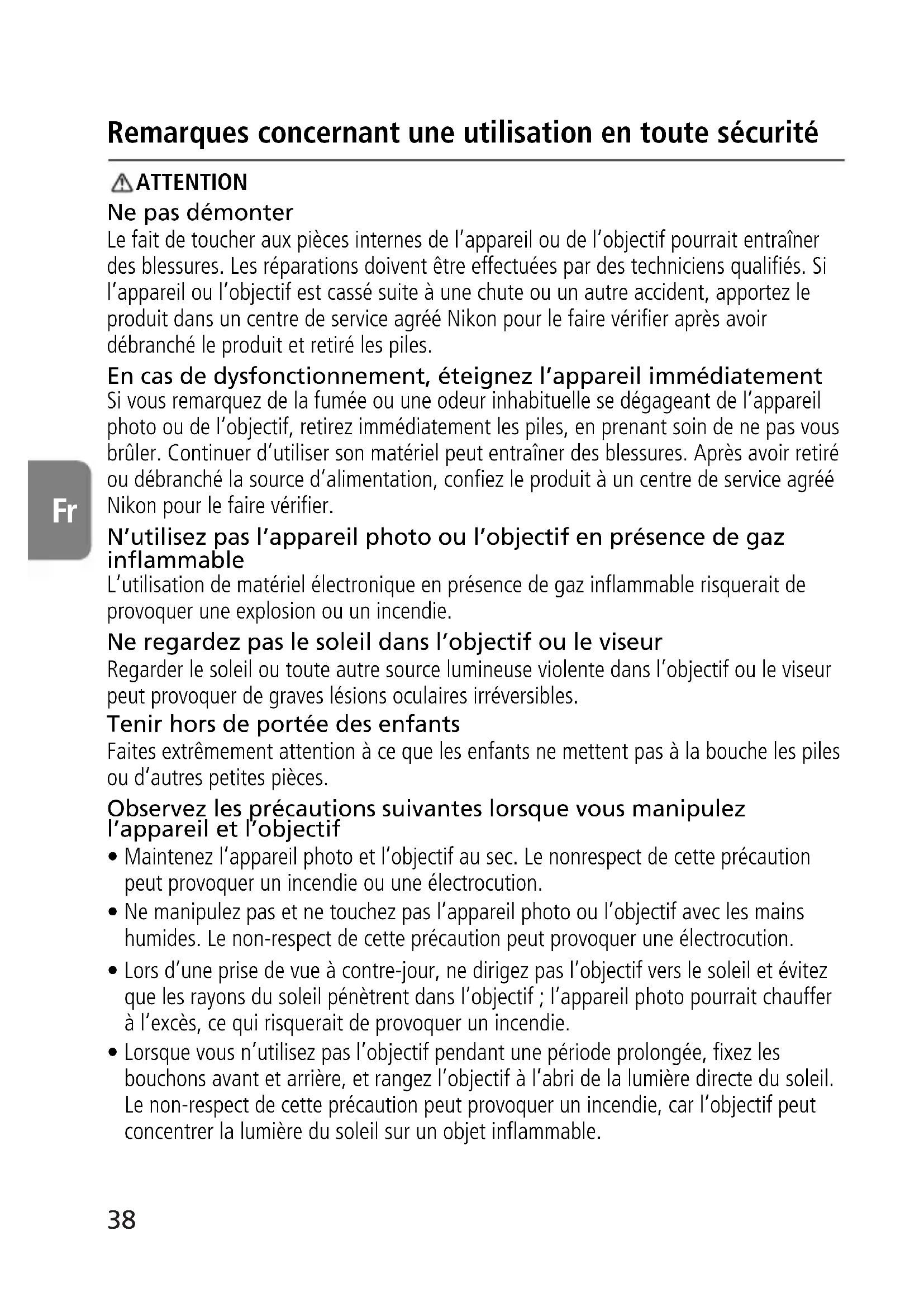 Remarques concernant une utilisation en toute sécurité ATTENTION Ne pas démonter Le fait de toucher aux pièces internes de l’appareil ou de l’objectif pourrait entraîner des blessures. Les réparations doivent être effectuées par des techniciens qualifiés. Si l’appareil ou l’objectif est cassé suite à une chute ou un autre accident, apportez le produit dans un centre de service agréé Nikon pour le faire vérifier après avoir débranché le produit et retiré les piles. En cas de dysfonctionnement, éteignez l’appareil immédiatement Si vous remarquez de la fumée ou une odeur inhabituelle se dégageant de l’appareil photo ou de l’objectif, retirez immédiatement les piles, en prenant soin de ne pas vous brûler. Continuer d’utiliser son matériel peut entraîner des blessures. Après avoir retiré ou débranché la source d’alimentation, confiez le produit à un centre de service agréé Nikon pour le faire vérifier. N’utilisez pas l’appareil photo ou l’objectif en présence de gaz inflammable L’utilisation de matériel électronique en présence de gaz inflammable risquerait de provoquer une explosion ou un incendie. Ne regardez pas le soleil dans l’objectif ou le viseur Regarder le soleil ou toute autre source lumineuse violente dans l’objectif ou le viseur peut provoquer de graves lésions oculaires irréversibles. Tenir hors de portée des enfants Faites extrêmement attention à ce que les enfants ne mettent pas à la bouche les piles ou d’autres petites pièces. Observez les précautions suivantes lorsque vous manipulez l’appareil et l’objectif